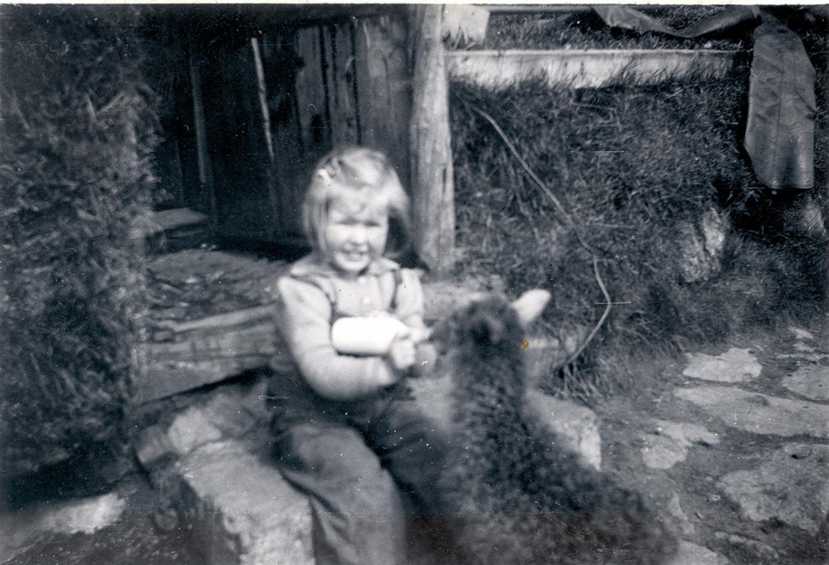 Ásdís Jónsdóttir gefur lambi úr pela. Í baksýn er inngangurinn að fjósinu á Einfætingsgili.