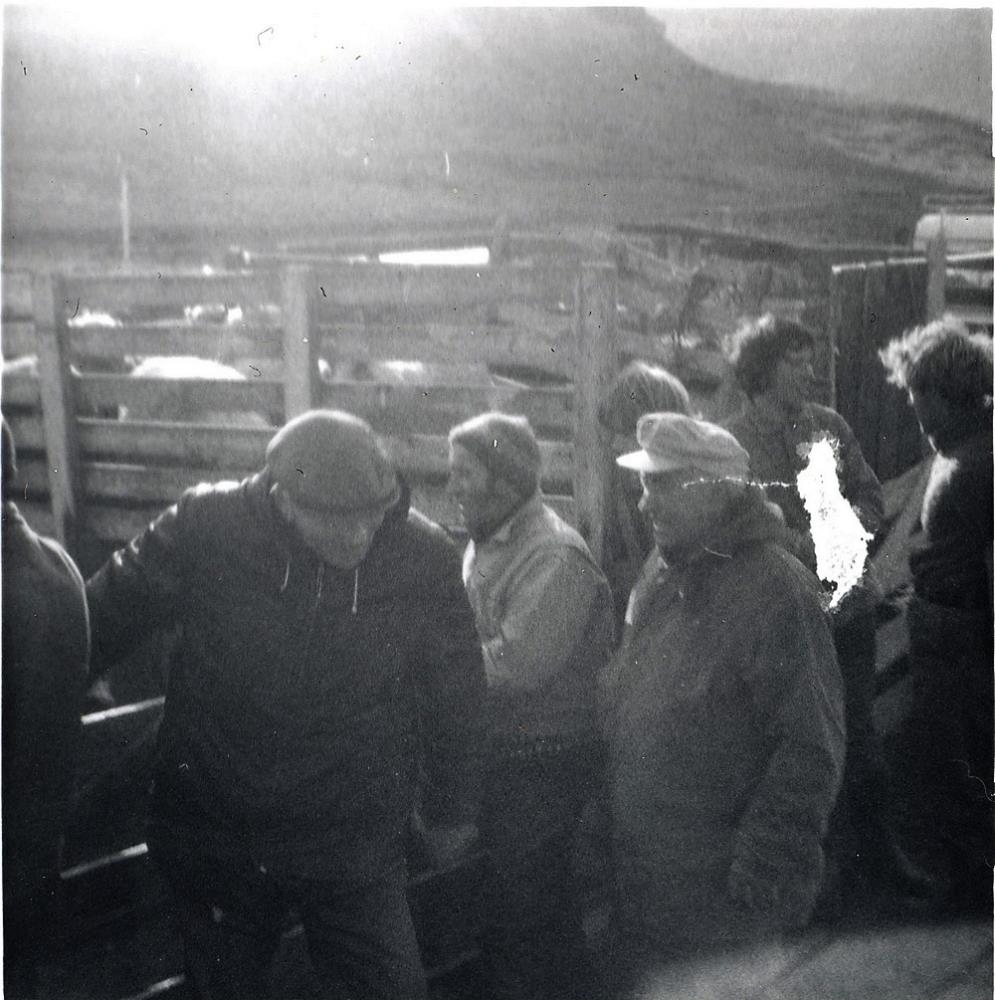 Þórður Sig, Halldór, Brynki, þá er annar hvor bræðranna Kristmundur eða Jónsi, Einar, og svo hinn bróðirinn, Jónsi eða Kristmundur. Brynki í Vagninum og sennilega Guðjón Haraldsson neðan við. Í baksýn fyrir miðju er senilega Brynja Valgeirsdóttir frá Broddadalsá.
