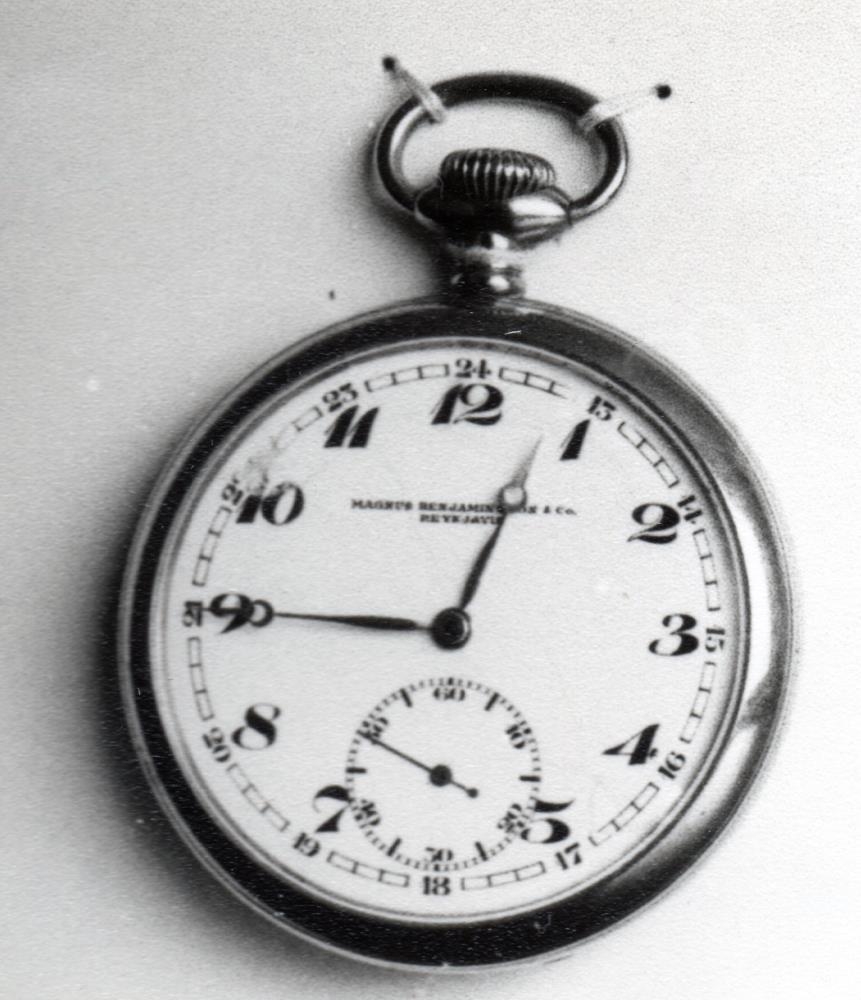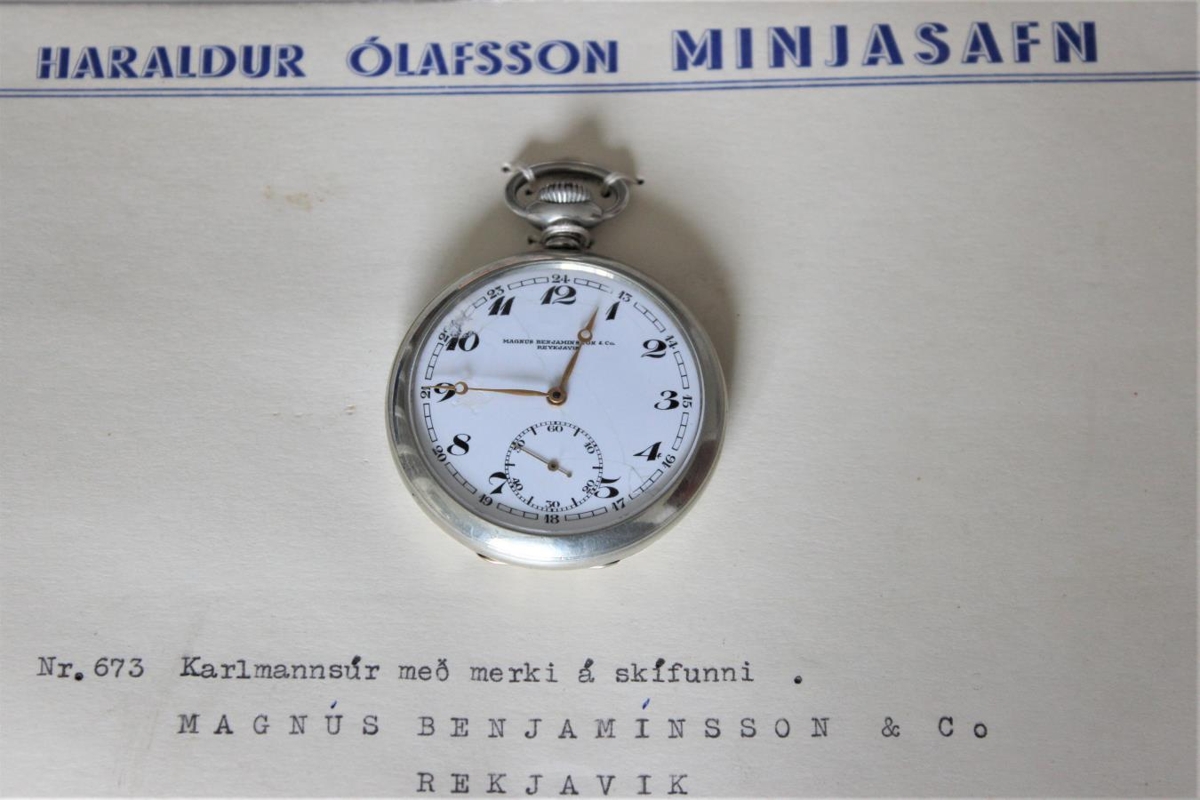 Vasaúr með hvítri skífu og tölustöfum. Skífa fyrir sekúnduvísi er neðst. Smíðað af úrsmíðaverkstæðið Magnús Benjamínsson & Co. Það var stofnað af Magnúsi Benjamínssyni (6.2.1853-2.3.1942) 1881 og starfaði til 1976.