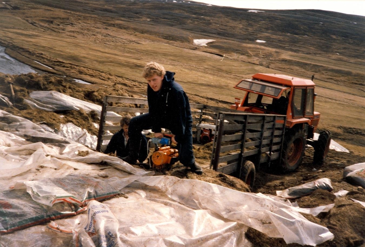 Feðgarnir Reynir Björnsson og Björn Guðmundsson. Reynir er að bera heyskera í áttina að útihlöðunni.