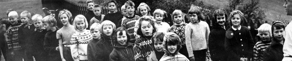 Skólabörn í Barnaskóla Akureyrar standa í röð fyrir inngöngu sæl og glöð kennara sínum Jónasi frá Brekknakoti. Líklega 1. eða 2. bekkur 1962 -1964. "Ég stóð alltaf fyrir aftan Svanfríði í röð og og við héldum alltaf jöfnu bili áður en við gengum inn í skólann með því að setja beinar hendur okkar á axlir þeirra sem á undann manni var. Þannig áttum við að halda jafnri röð um leið og við fengum leyfi til að labba upp tröppurnar og inn í skólann." segir Valgerður J. Frímann.