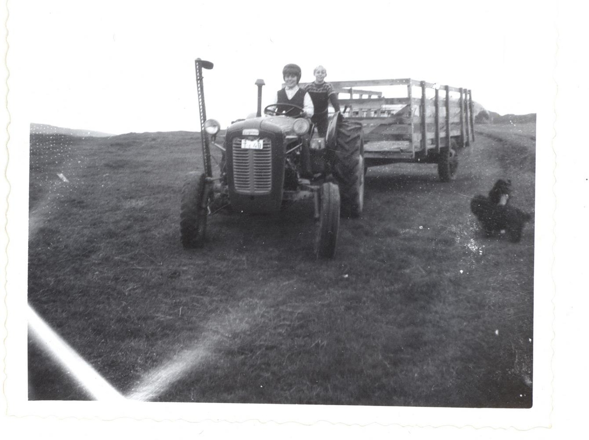 Lilja á Bassastöðum keyrir Ferguson Td-49 með áfastri sláttugreiðu og vagn í eftirdragi. Drengur á beisli, tveir hundar fylgjast með.