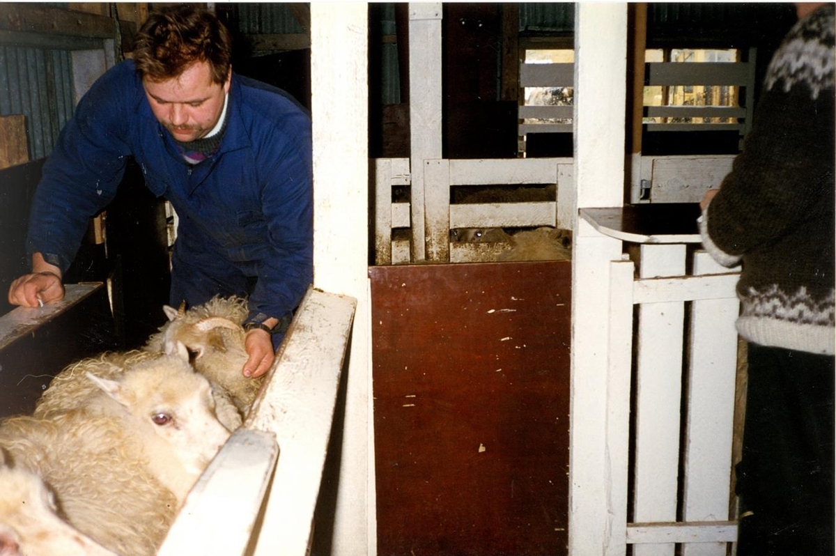 Maður að nafni Guðbrandur að framvísa fé úr rétt sláturhússins. Tekið í sláturhúsinu á Borðeyri.
