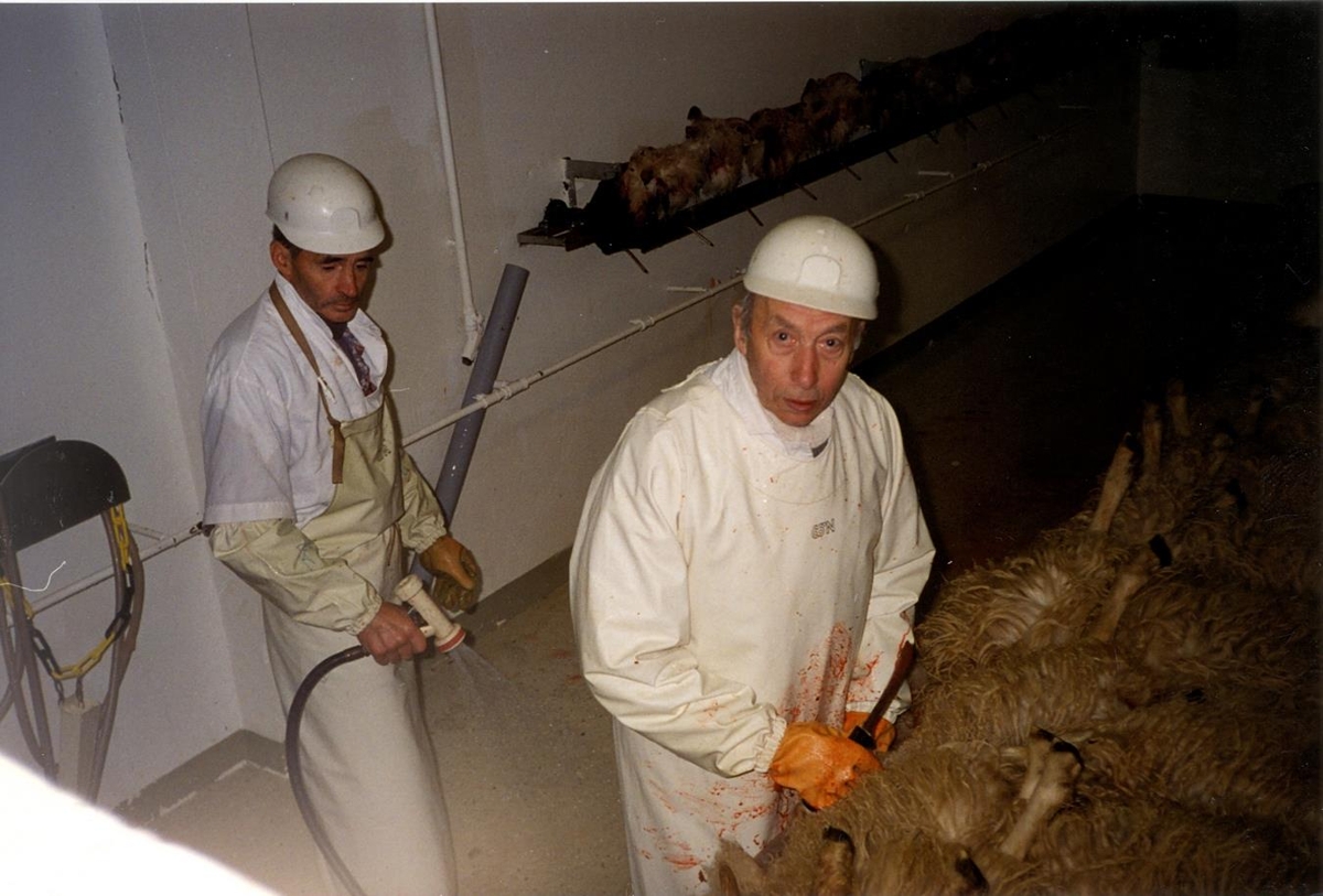 Ragnar Elísson í Laxárdal v.m. (stunga) og Vilhjálmur Ólafsson á Kollsá h.m. (hausari) að störfum. Tekið í sláturhúsinu á Borðeyri.