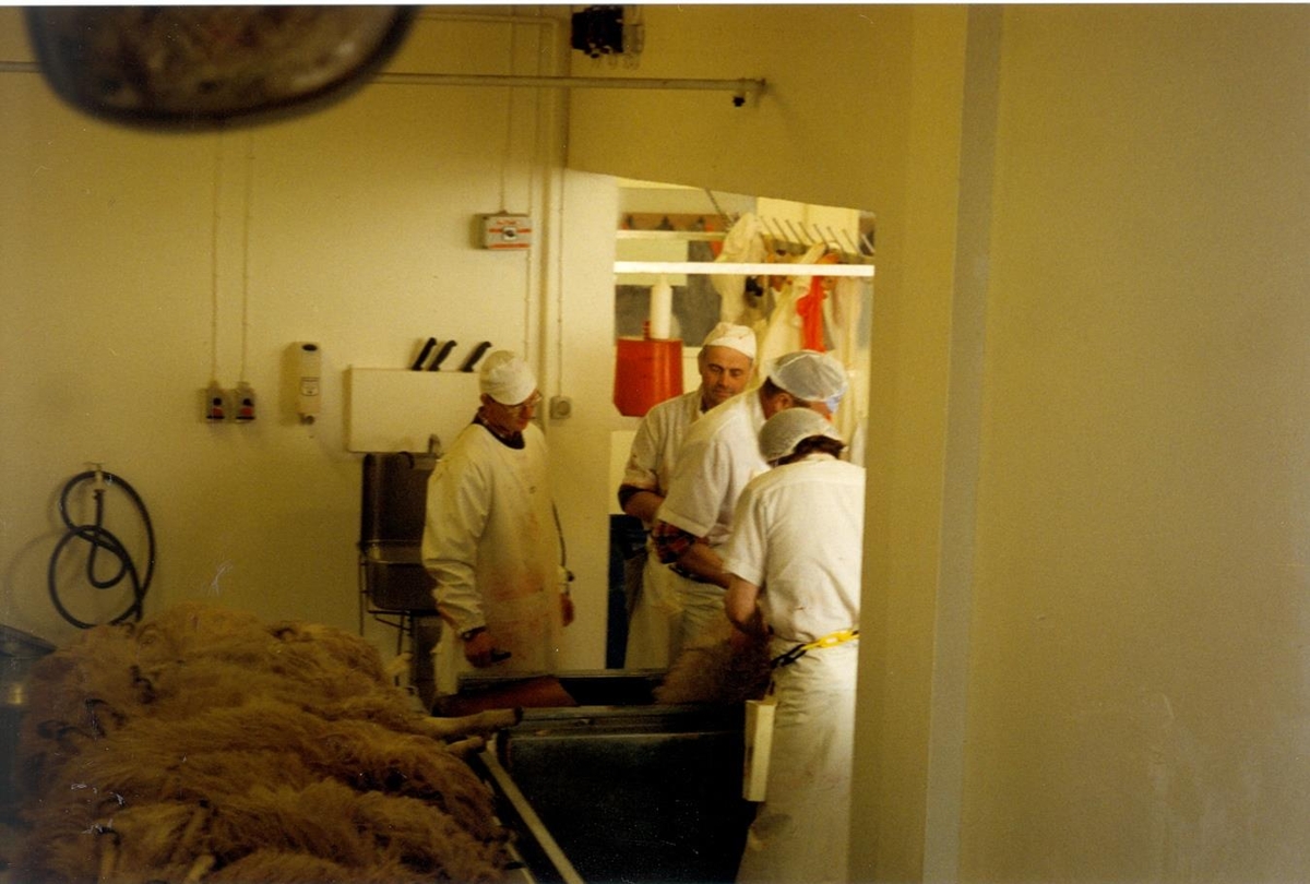 Verið að taka skrokka af blóðbandi til fyrirristu. Einar Einarsson, til vinstri, og Sveinbjörn Jónsson í Skálholtsvík. Tekið í sláturhúsinu á Borðeyri.