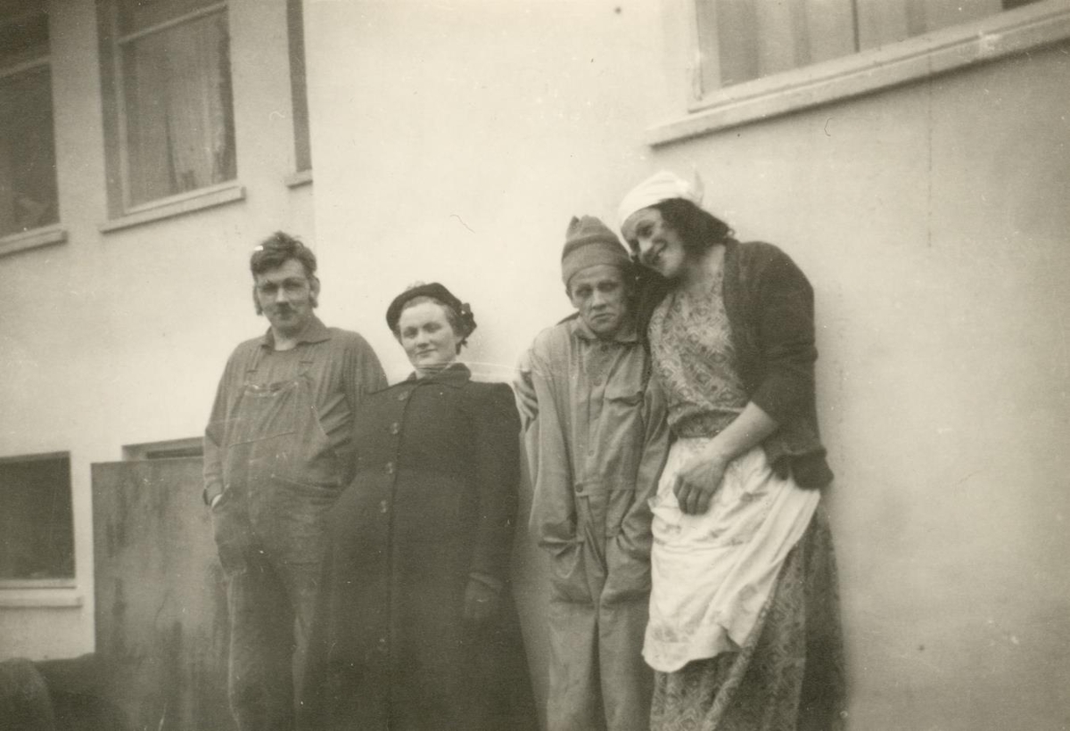 Leikarar í Lása vinnumanni stilla sér upp aftan við Sævang. F.v. Grímur Benediktsson á Kirkjubóli, Sigríður Guðjónsdóttir í Heiðarbæ, Björn Guðmundsson í Miðdalsgröf og lengst til hægri er síðan Samúel Alfreðsson á Kollafjarðarnesi í kvenmannsgerfi. Sammi faðmar Bjössa.