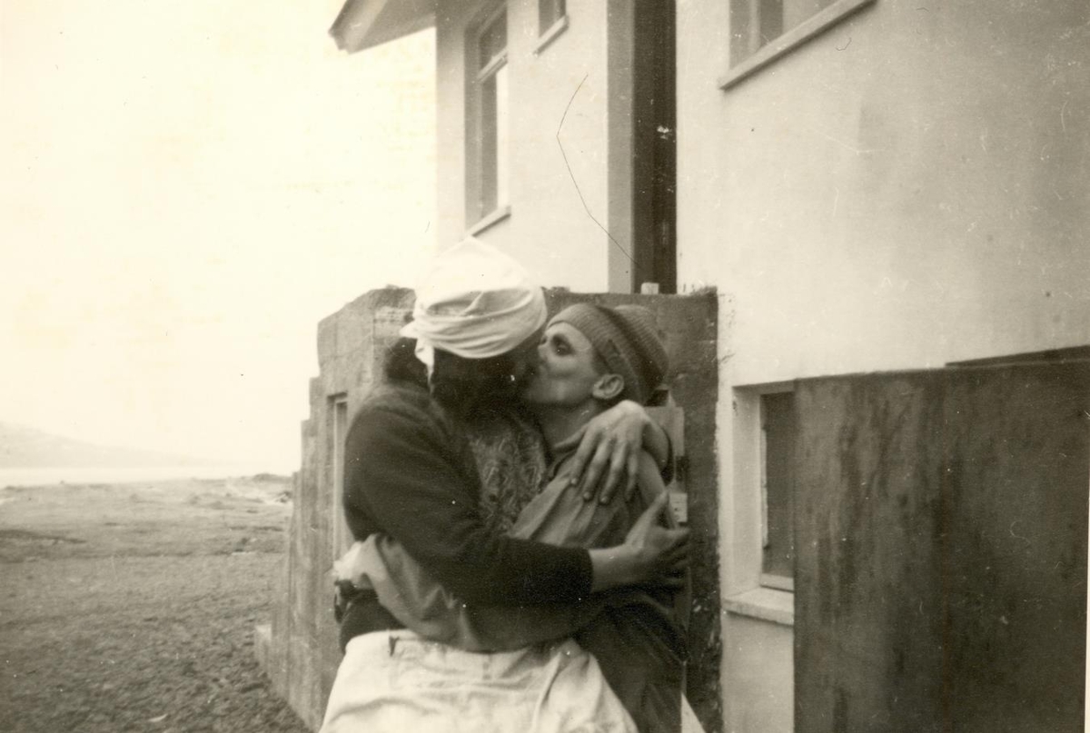 Samúel og Björn smella rembingskossi hvor á annan. Þarna ræður leikgleðin greinilega ríkjum.