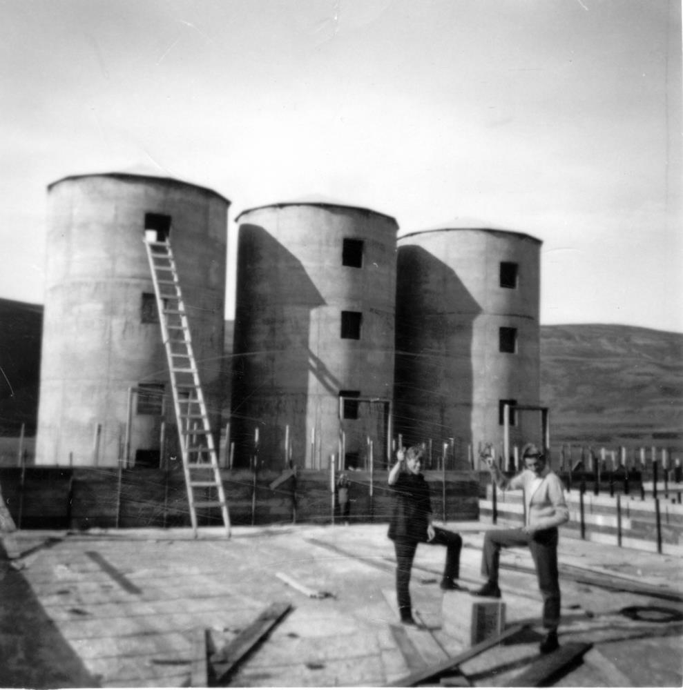 Á myndinni eru Hrafn Hauksson, Krummi, og Sigurður Jónsson á Felli að vinna í grunni fjárhúsanna.