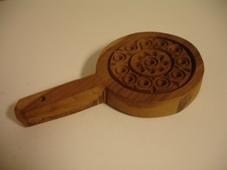 haldi. Á haldinu er op. Í aðra hlið plattans er búið að skera út munstur.