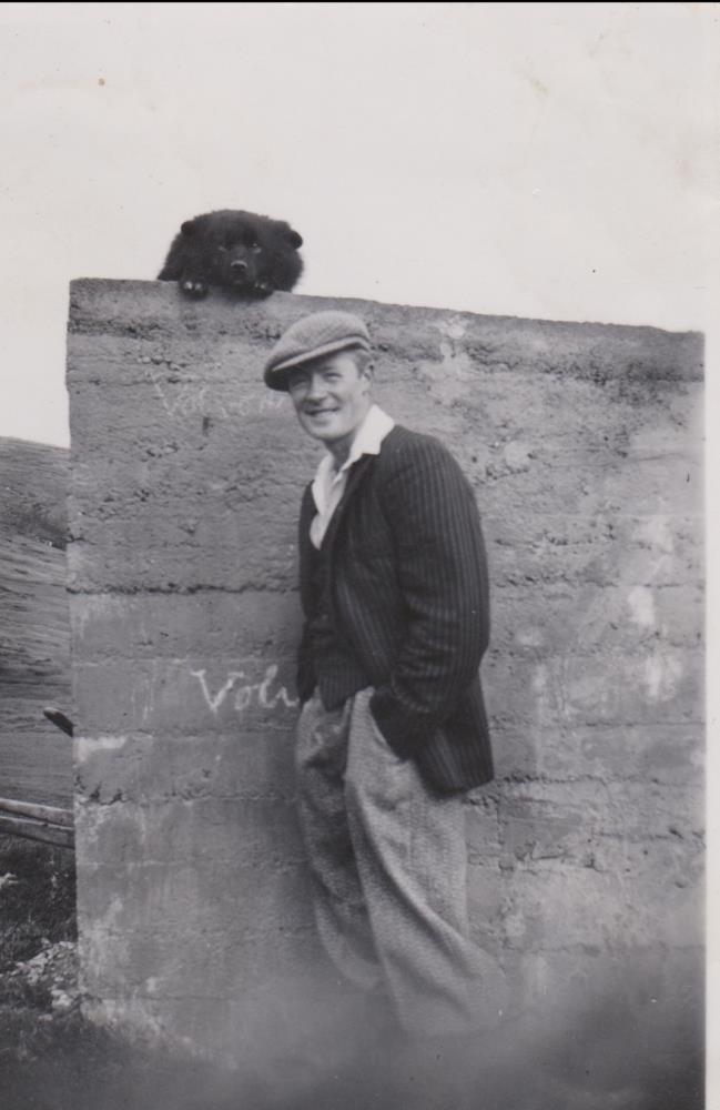 Lýður Sigmundsson stendur undir steinvegg. Hundur hefur klifrað til að kíkja yfir vegginn.