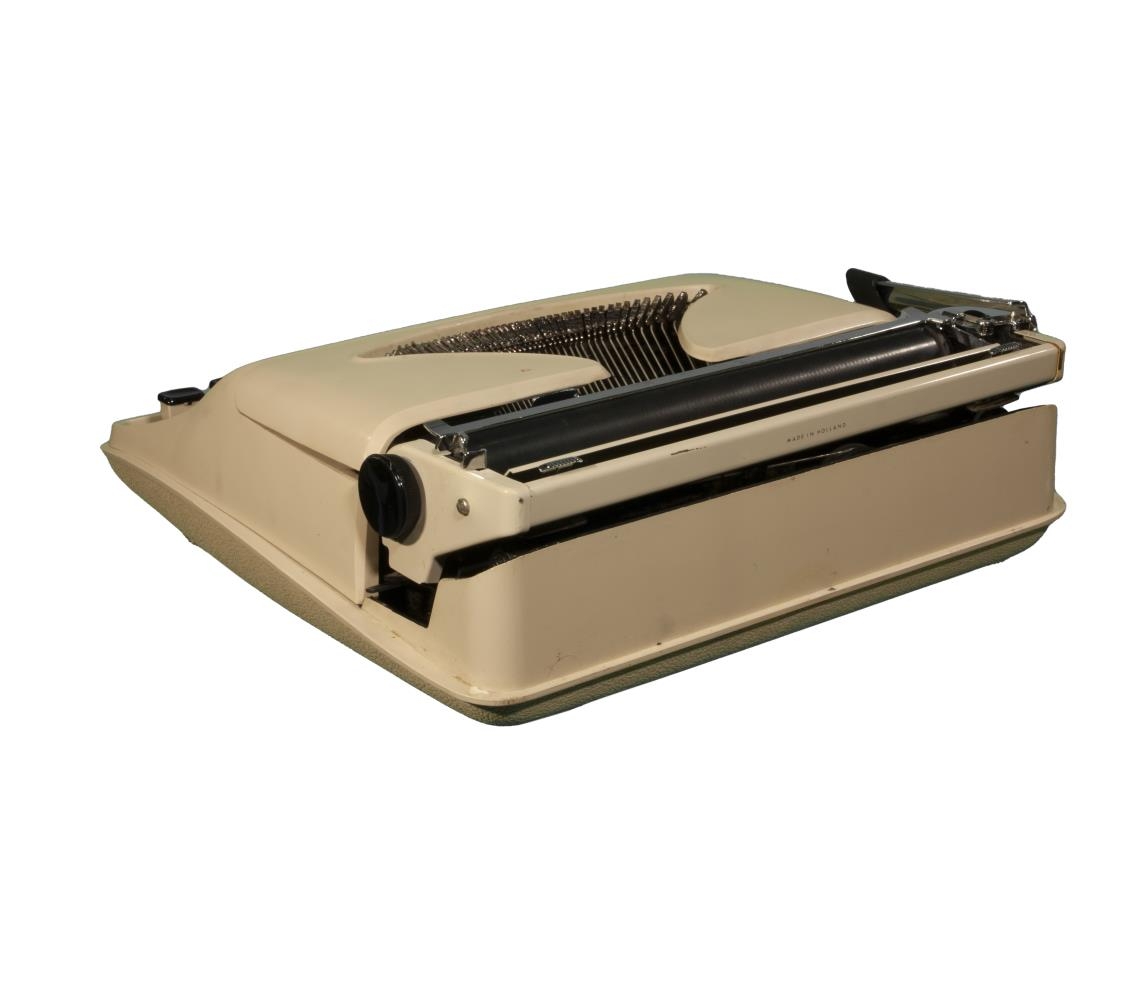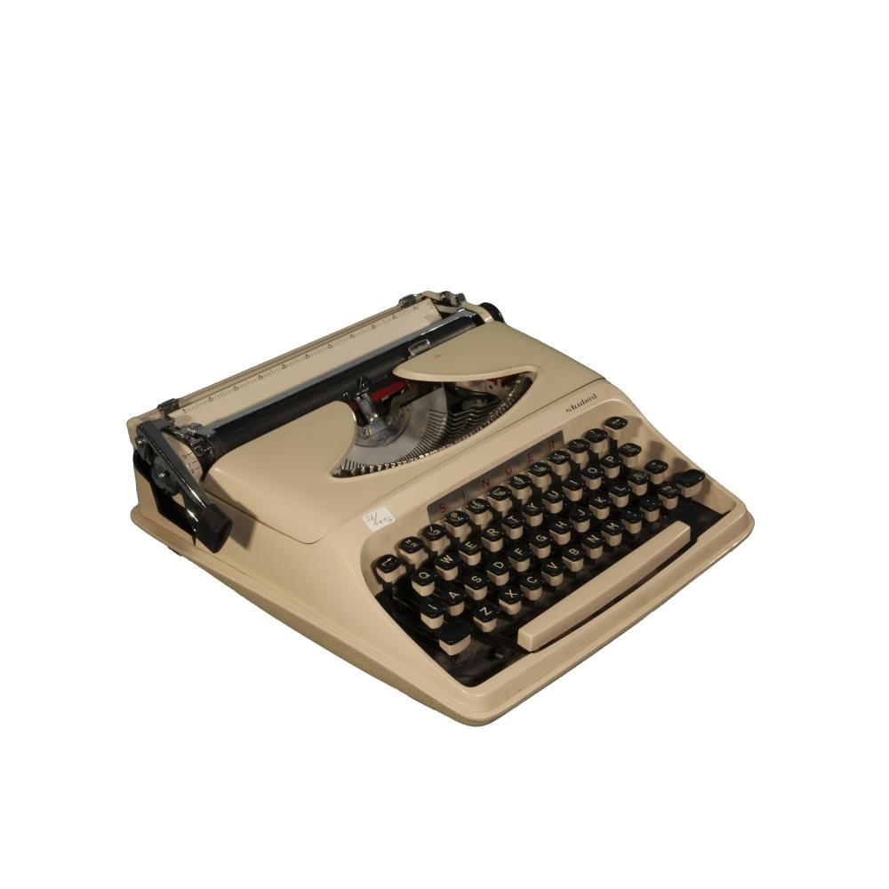 lítil svokölluð ferðaritvél ( skólaritvél ) í drapplitri plasttösku. Gefandi