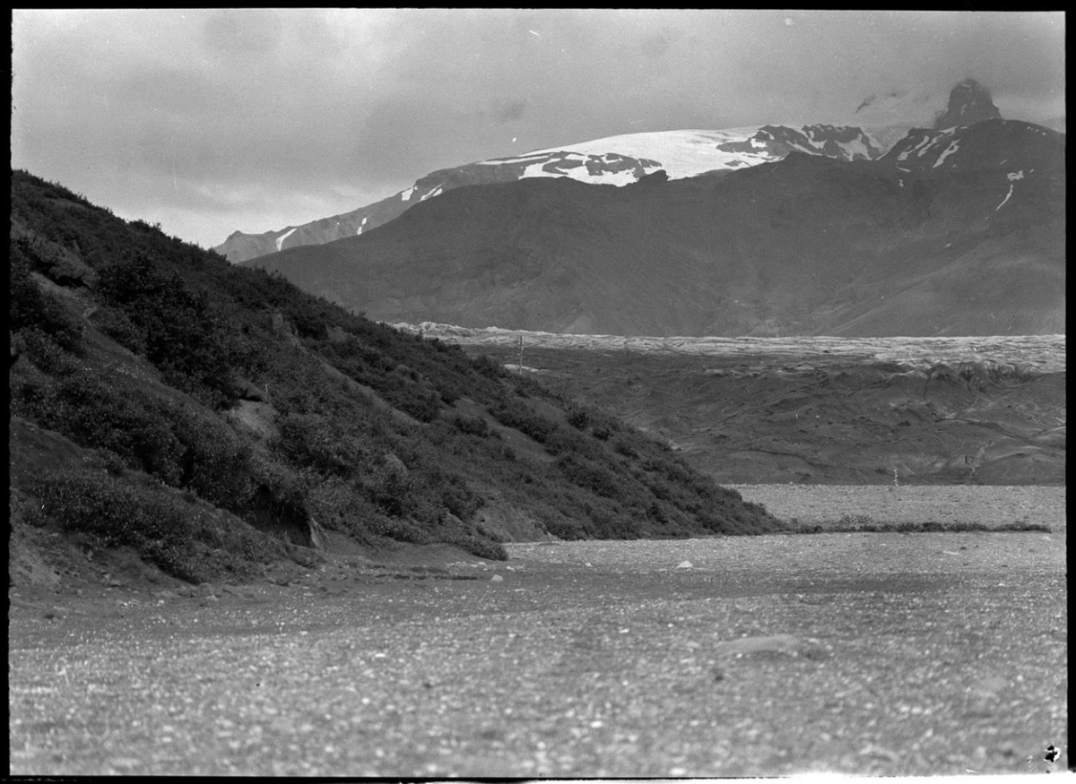 Við Skaftafell. Kjarrigrónar brekkur og jökulrönd með fjall í baksýn.