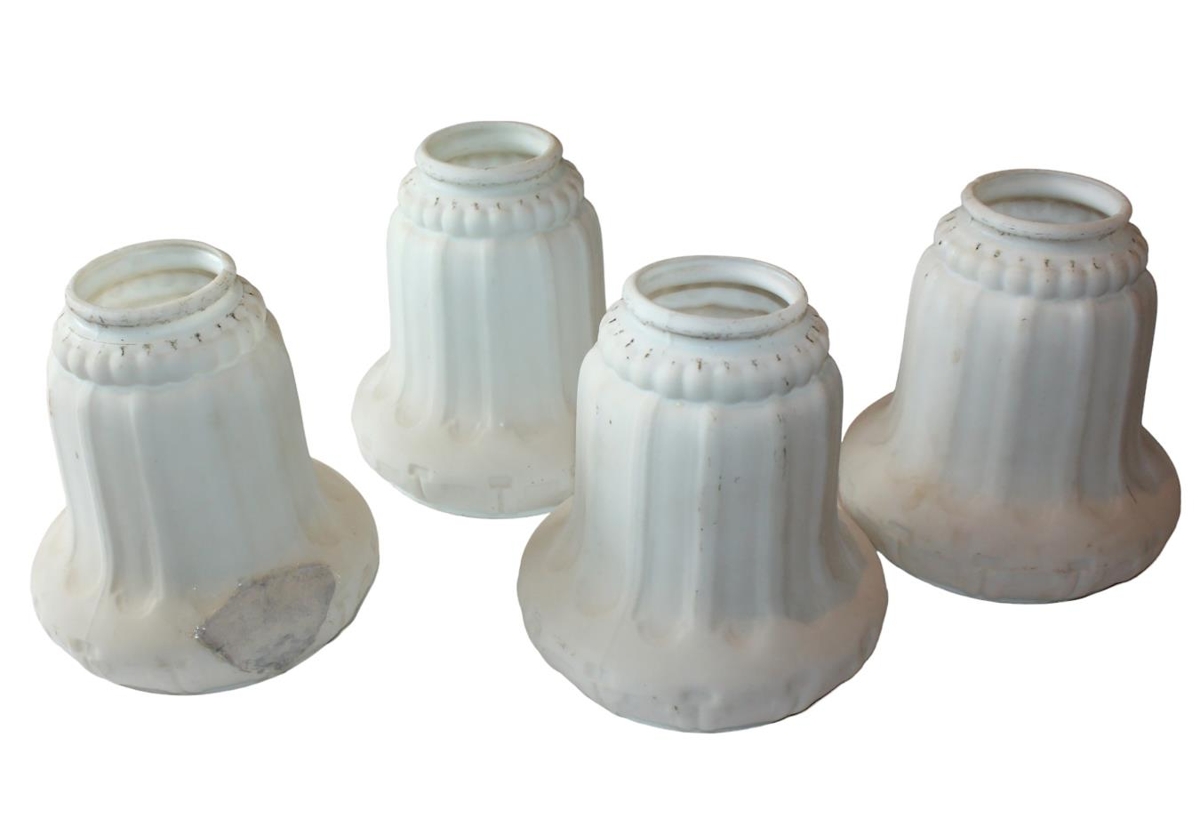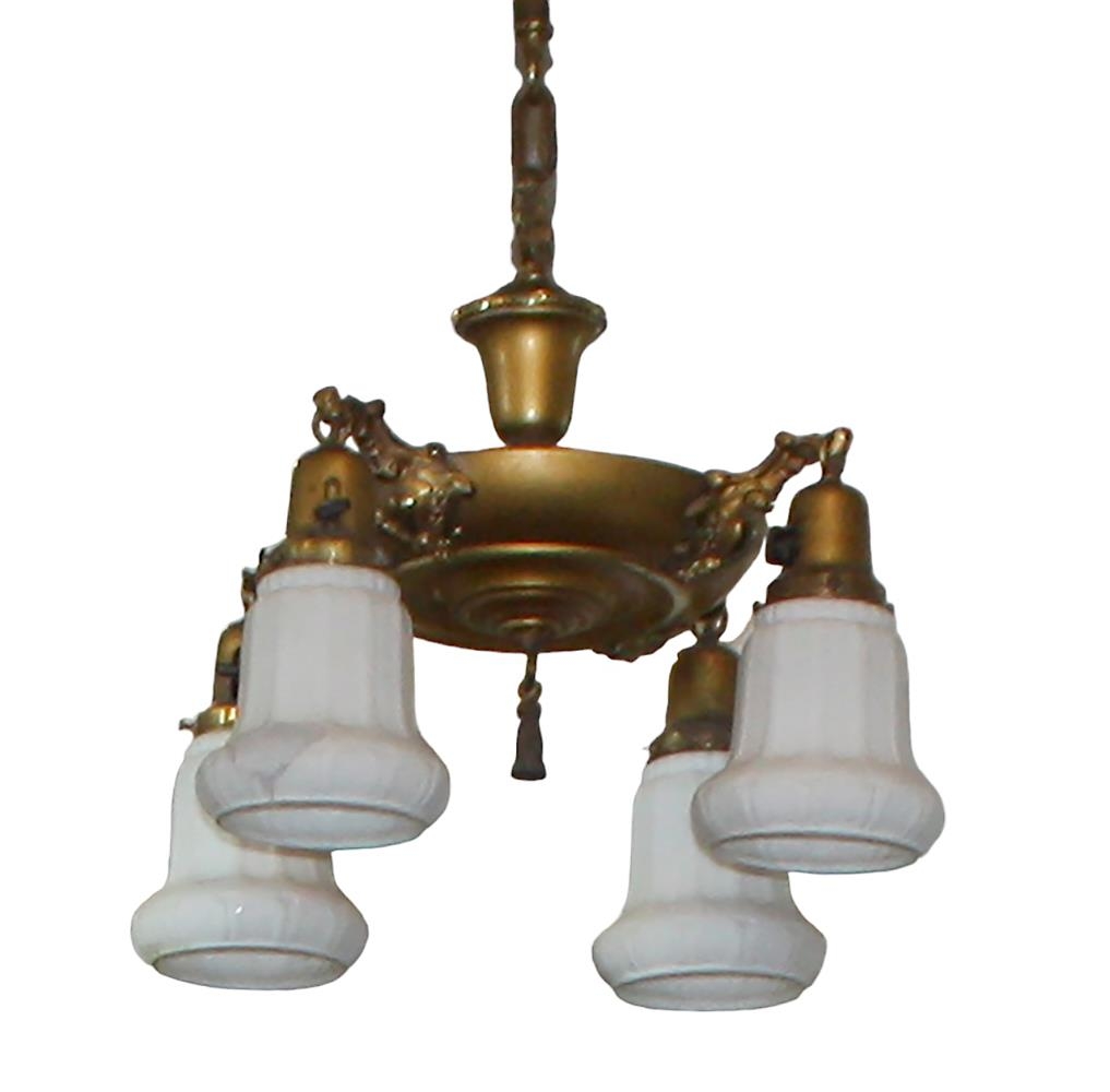 Koparljósakróna með fjórum hvítum glerkúplum og rósetta fyrir rafmagnsljós.