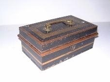 Peningakassi úr málmi. Svartur að lit með gylltum og bronslituðum/brúnum röndum. Ofan á kassanum er hald og framan á er skrá með lykli í. Ofan í kassanum er laus hirsla sem hægt er að taka uppúr. Í henni eru þrjú hólf, tvö til hvorrar hliðar með loki sem opnast til endanna en í miðjunni er lítið hólf með renniloki sem hægt er að renna af þegar hirslan er tekin uppúr kassanum.