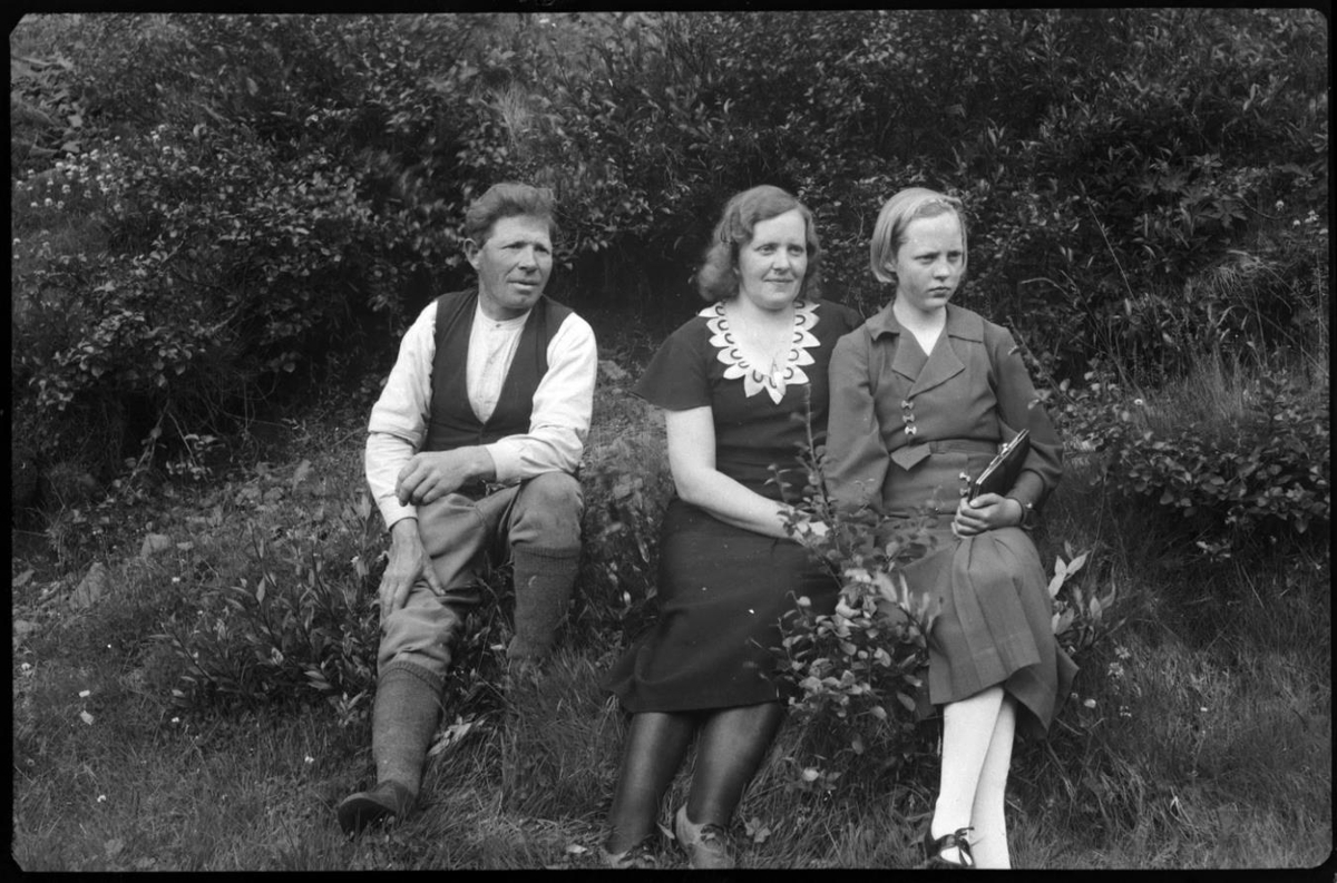 Karlmaður og tvær konur sitja í lynggróinni brekku.