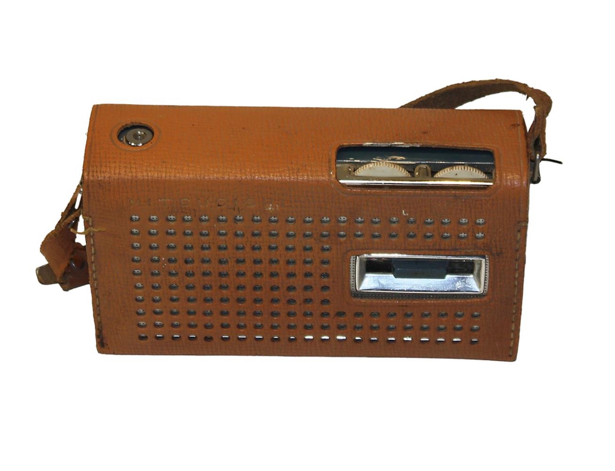 Útvarp lítið ferðatæki í hulstri úr leðurlíki. Mitshubishi fyrir 4 AA batterí. Kemur úr eigu Halldórs Jónssonar Melteig 8 Gefandi: Guttormur Jónsson