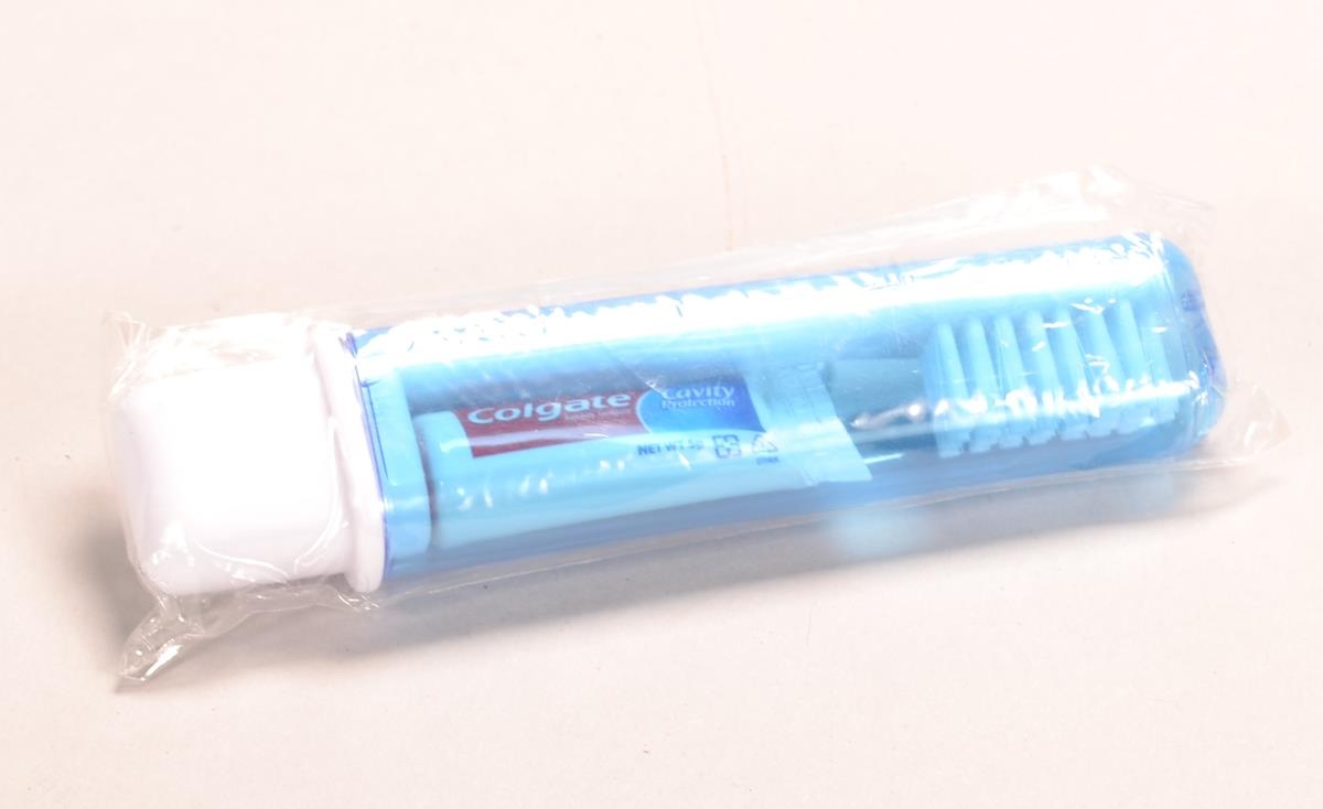 Ferðatannbursti og Colgate tannkrem í þar til gerðum umbúðunum