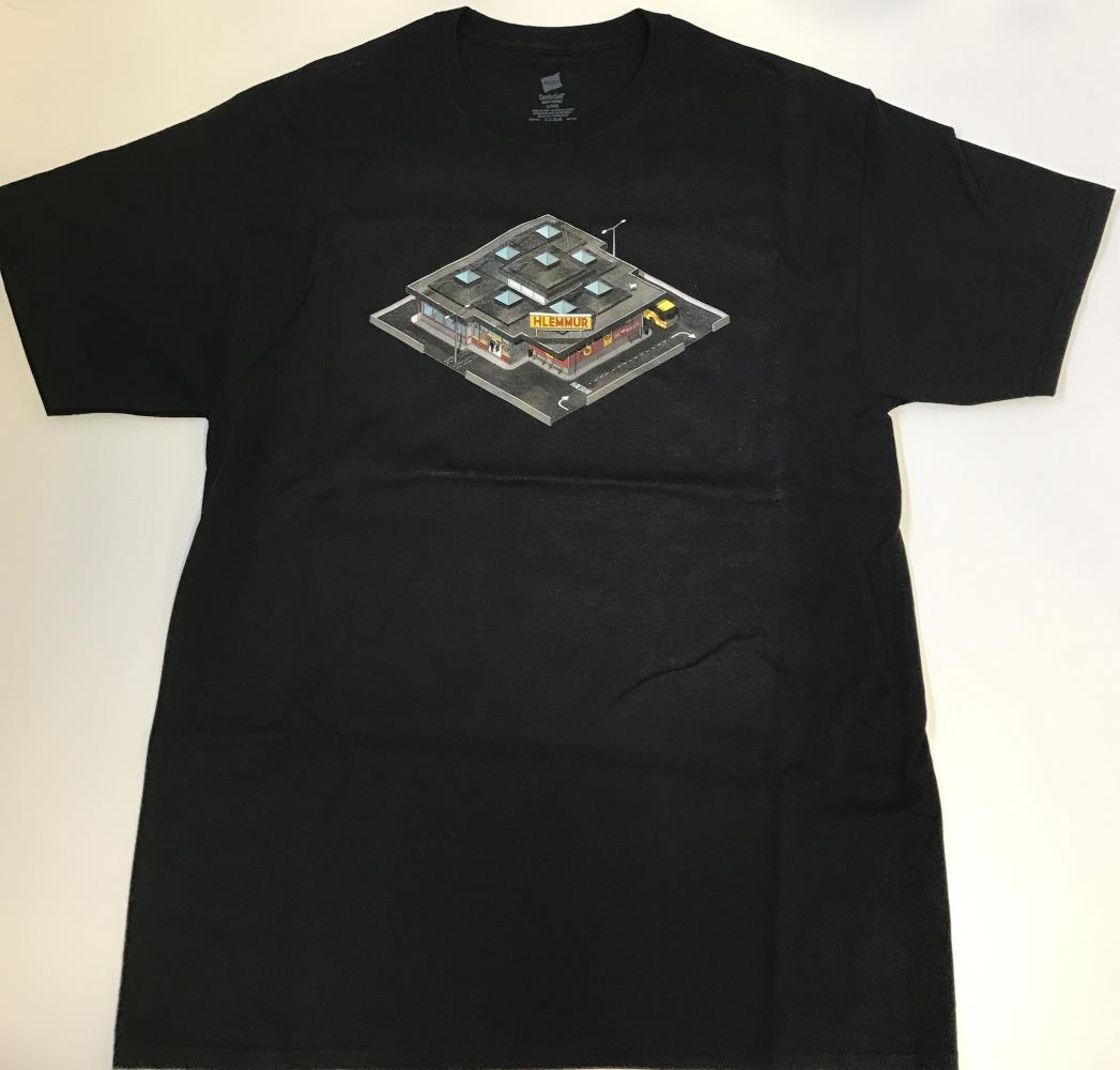 Svartur stuttermabolur með áprentaðri mynd af Hlemmi. Utan á Hlemmi sést merkingin We Einn af 8 bolum sem Hjalti hannaði mynd utan á í tilefni af sýningu í Hönnunarsafninu árið 2014. Hjalti hlaut hönnunarverðlaun Söderberg það ár. Á bolunum voru myndir af húsum í Reykjavík sem tengjast lífi Hjalta sem býr og starfar í New York.