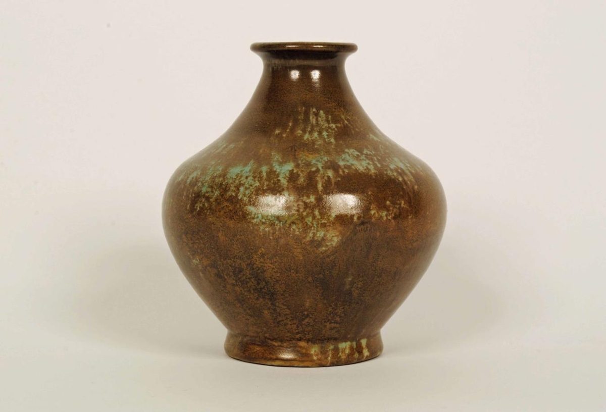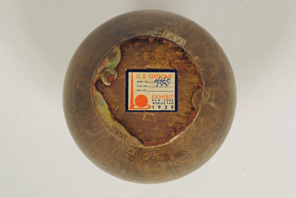 Lítill brúnleitur vasi með grænum yrjum, renndur. Vasinn er merktur Lydiu Pálsdóttur (Zeitner/Sternberg). Undir vasa er miði frá Heimssýningunni í New York 1939. Vasinn var sendur þangað ásamt fleiri munum frá Listvinahúsinu. Líklega úr íslenskum leir.