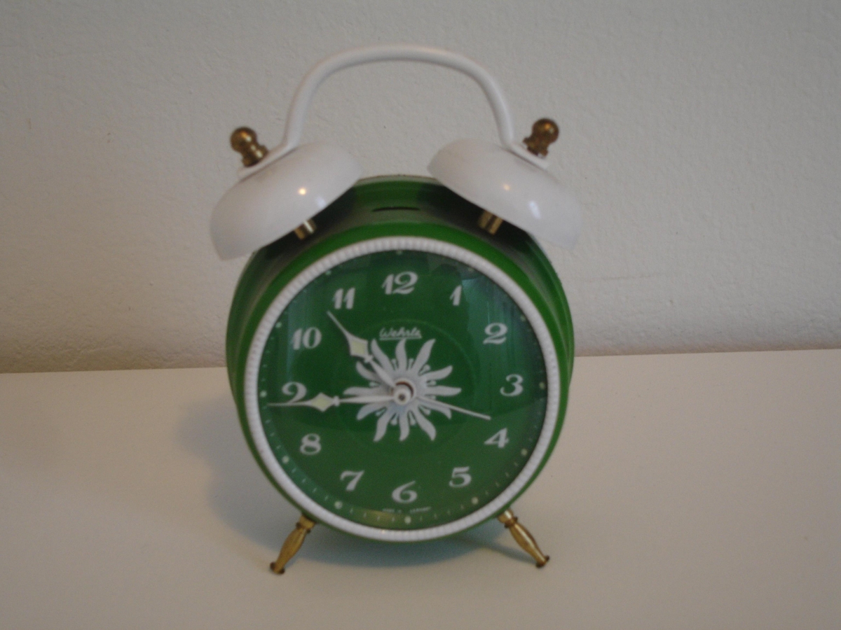 Hringlótt klukka, græn og hvít. Stefnur á tveimur gylltum fótum. Hvítar bjöllur og hald ofan á. Á klukkuskífunni stendur " Wehsle" og neðst "MADE IN GERMANY".