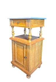 Náttborð úr ljósum við, með skáp og skúffu. Borðplata er úr marmara.