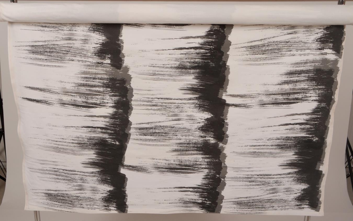 Bómullarlengja, með handþrykktu mynstri, tvílitt svart og grátt. Yfir efnisstrangann eru þrjár dökkar lóðréttar línur með gráum flekkjum í. Úr þeim dragast svartar þynnri línur lárétt yfir flöt. Gáru-mynstur.