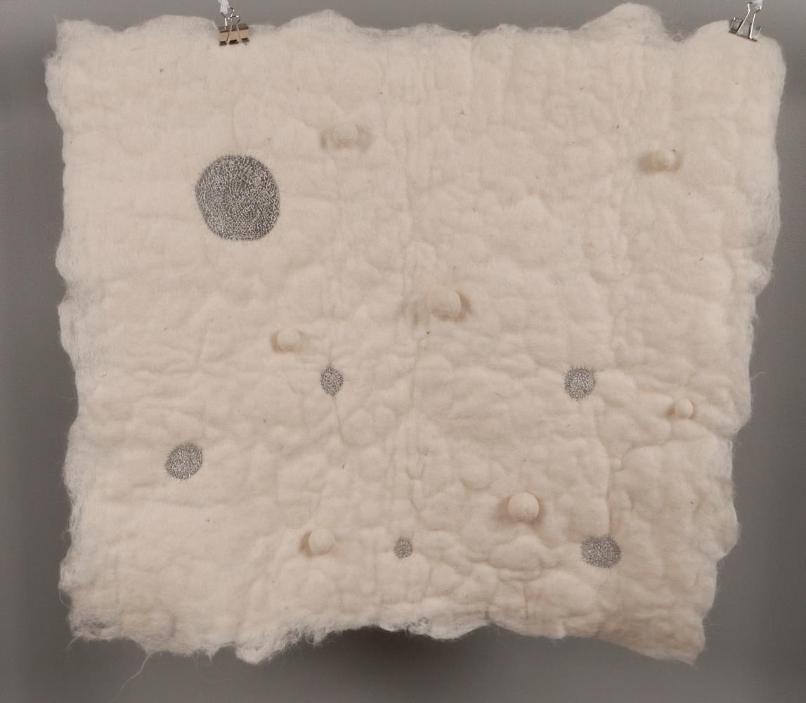 Ferningslaga mynd úr ull, hringlaga mynstur eru saumuð í þæfða ull með silfurþræði.