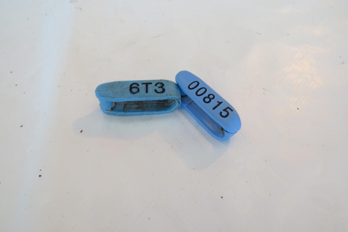 Fjármerki úr plasti með númerinu 6T3 sem er bæjarnúmerið á Broddanesi.