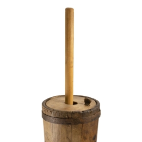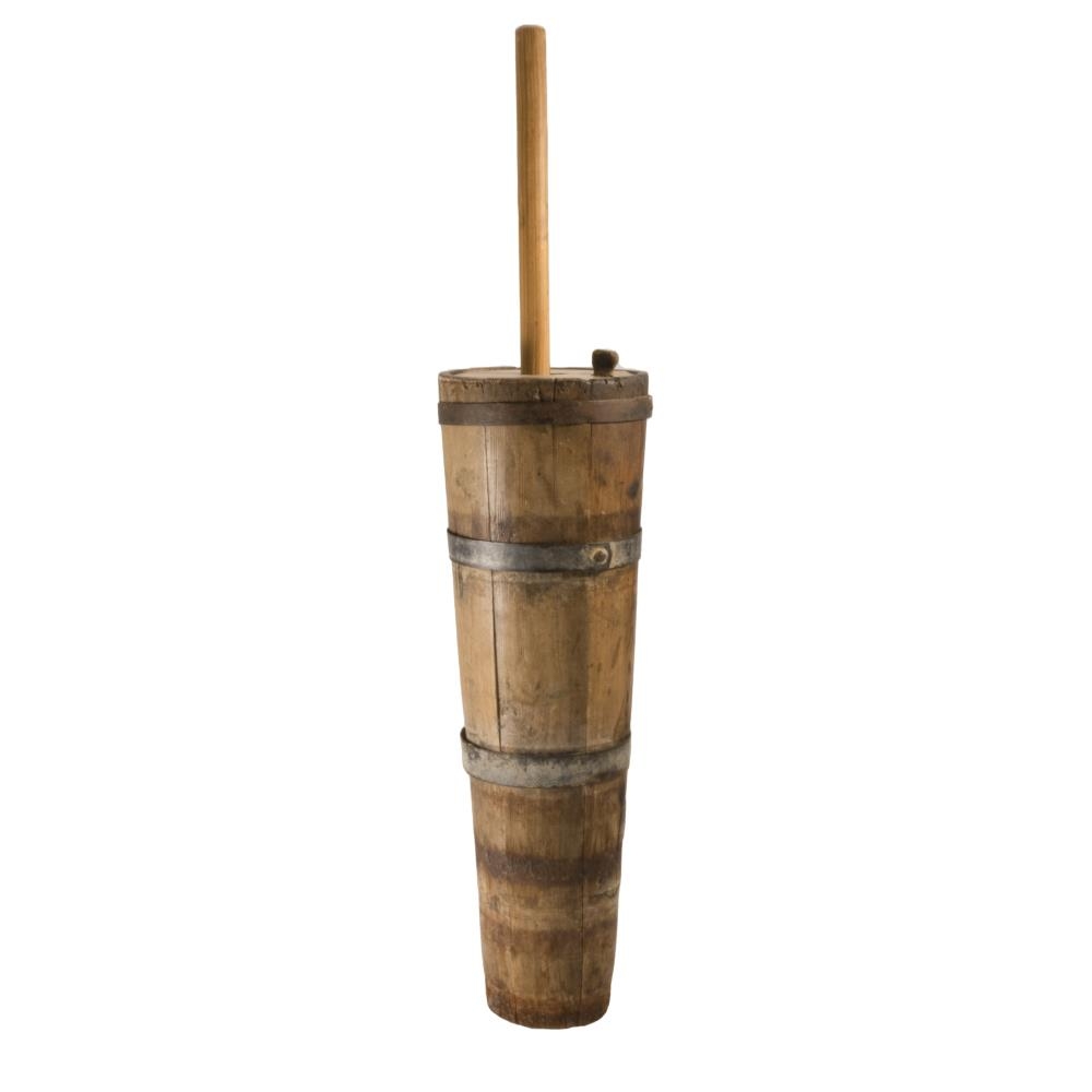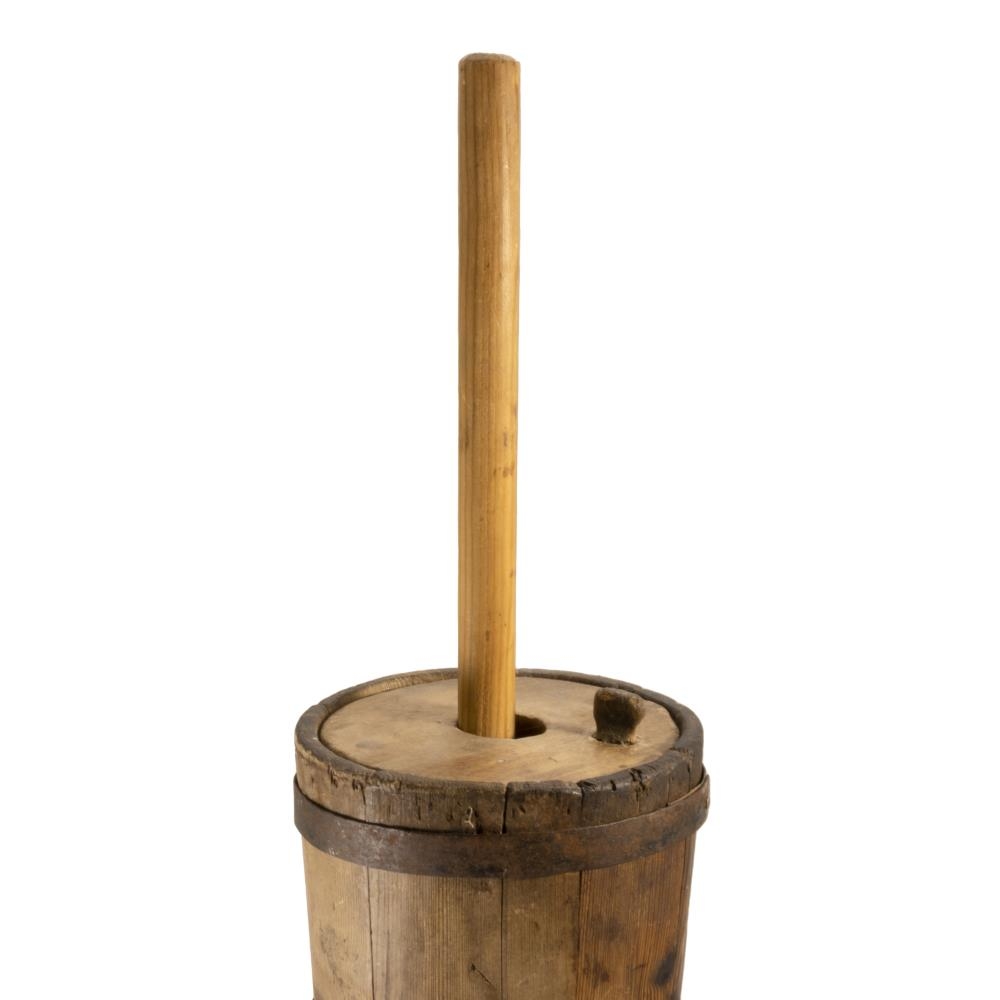 Strokkur þessi var fyrst í búi hjónana Margrétar Jónsdóttur frá Hnausum og Teits gullsmiðs Magnússonar Bergmann í Litlabæ á Álftanesi. Teitur smíðaði strokkinn um 1830. Eftir lát hans giftist Margrét aftur ( 1835) og þá Hallgrími Jónssyni hreppstjóra í Guðrúnarkoti og flutti hún þá mér sér í bú þeirra strokkinn. Eftir þeirra dag en Margrét dó 1903 og Hallgrímur 1906, komst strokkurinn í eigu hjónanna á Akri, þeirra Guðbjargar Sigurðardóttur og Sveins Oddssonar Kennara. Var hann lengi í búi þeirra. Guðbjörg gaf svo Teiti Stefánssyni frá Hvítanesi í Skilmannahreppi smið á Akranesi strokkinn en Teitur þessi var dóttursonur Teits gullsmið í Litlabæ. sonur Teits, Stefán smiður á akranesi og móðir hans, Hulda Jónsdóttir gáfu safninu strokkinn að Teiti látnum.