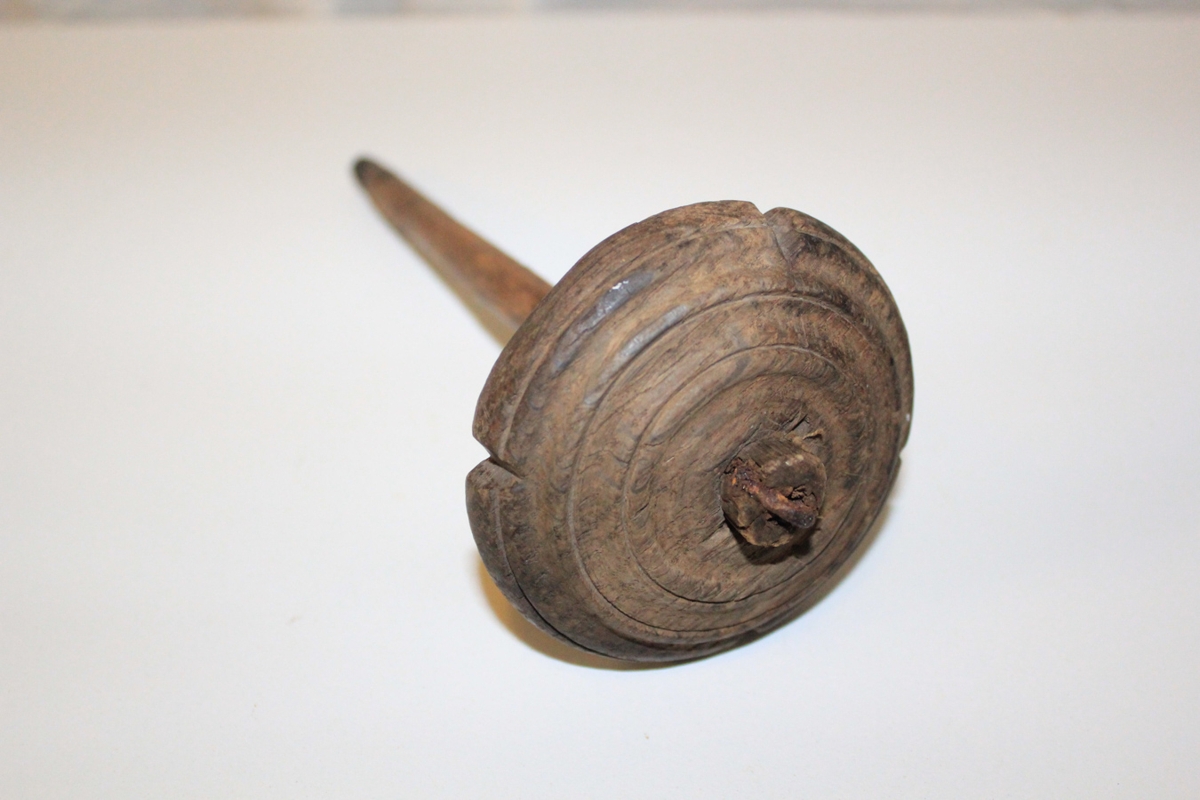 Teinn úr tré með snúð úr tré og hnokka úr járni á öðrum endanum. Notað til að spinna/tvinna band. Efnisbútur er á endanum þar sem teinninn gengur í snúðin, trúlega til að teinninn sitji fastar.
