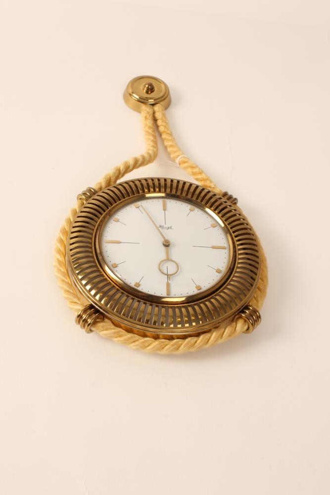 Lítil veggklukka, bronslituð, snúra utan um klukkuna sjálfa.