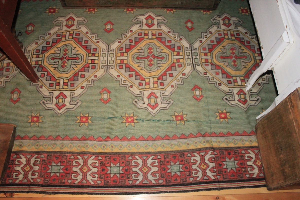 Útsaumað gólfteppi. Undir útsaumsstriganum er brúnleitt bómullarefni. Fanney sem saumaði teppið var gift Jóni Emil Stefánssyni húsasmíðameistara. Hann byggði Hvol árið 1930, húsið sem nú hýsir byggðasafnið og þar bjuggu þau alla tíð.