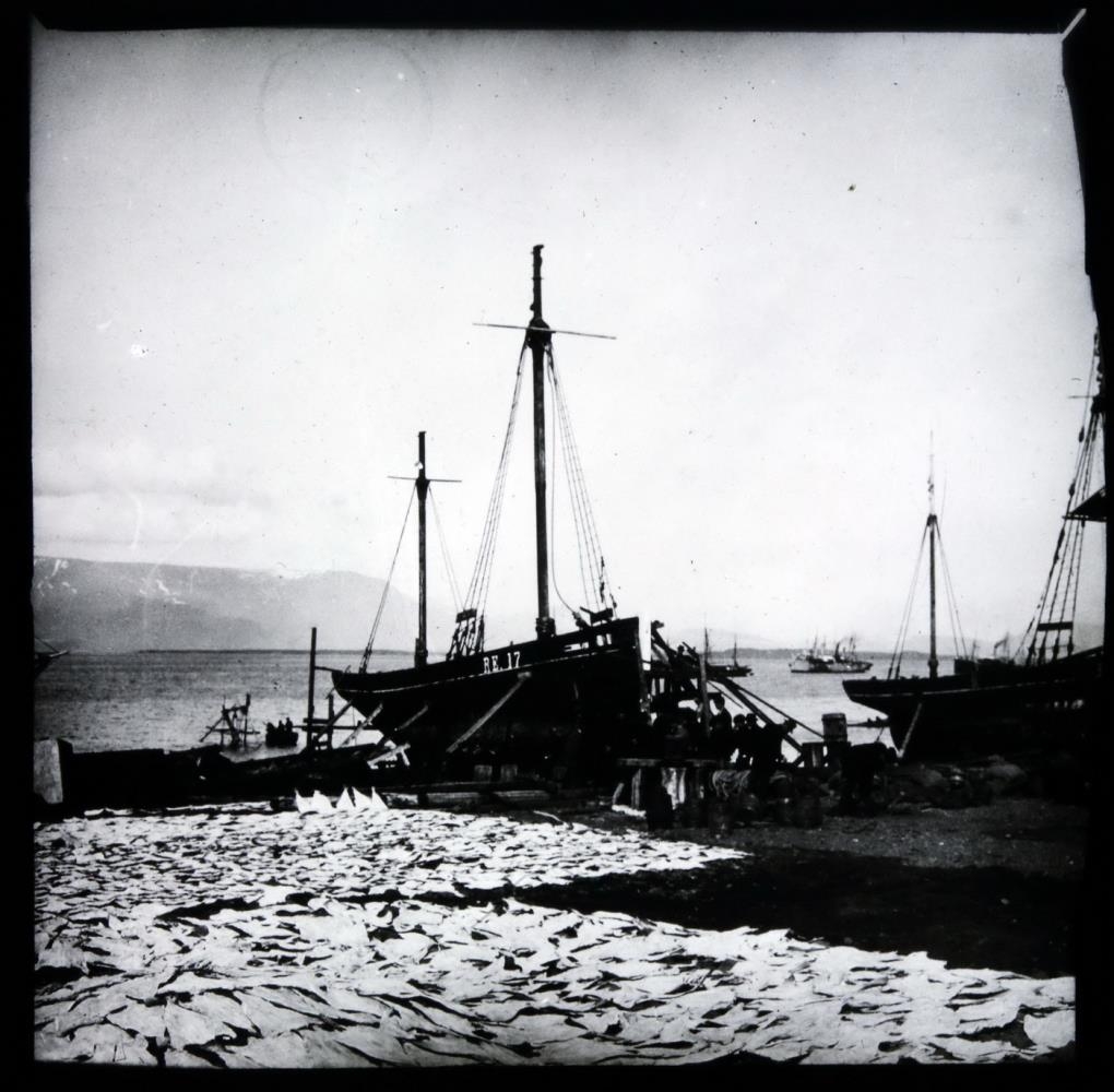 Tveir kútterar í slipp, á öðrum þeirra má sjá einkennisstafina RE 17. Fremst liggur saltfiskur til þurrkunar. Úti á legunni má sjá gufuskip.