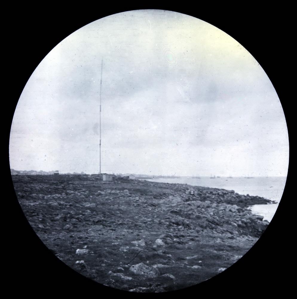 Hátt og grannt loftnetsmastur styrkt með stögum og við það lítill skúr. Marconi-stöngin.