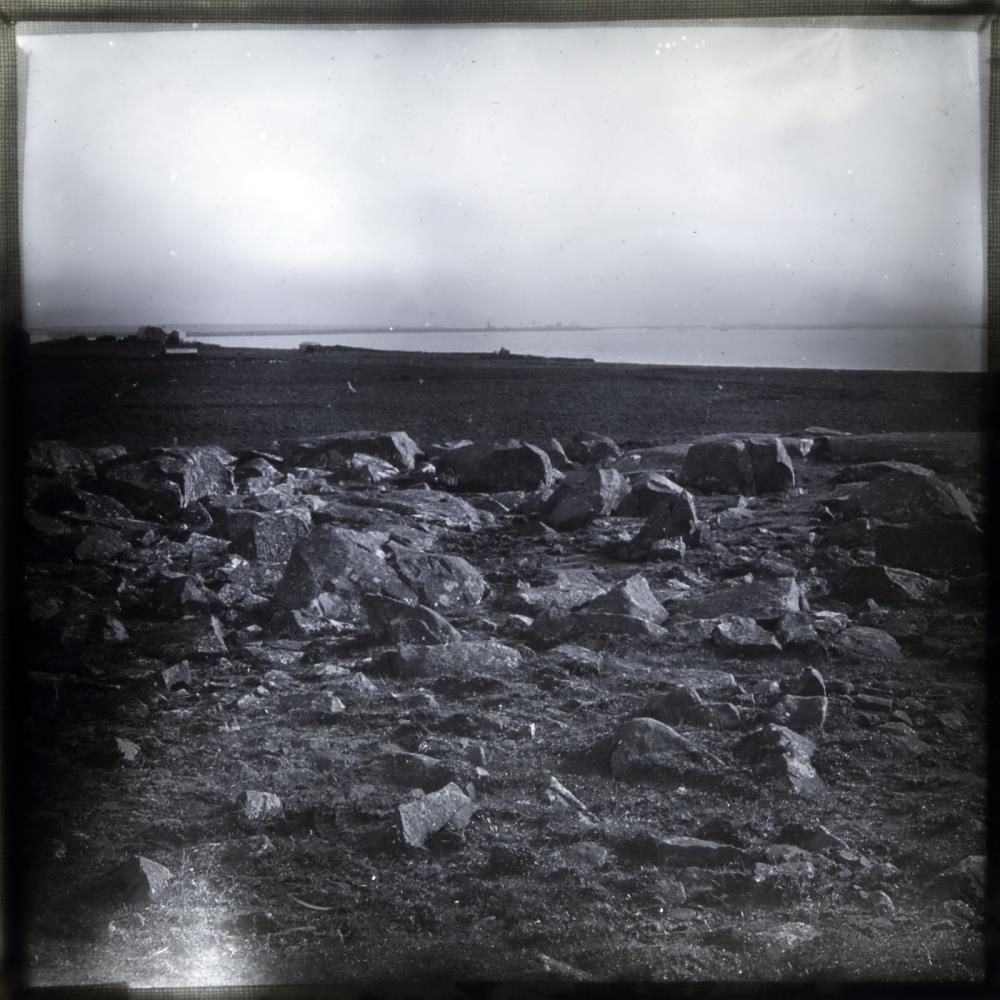 Í forgrunni er stórgrýtt urðarholt, í baksýn sveitabær og strandlengja. Bessastaðir í fjarska.