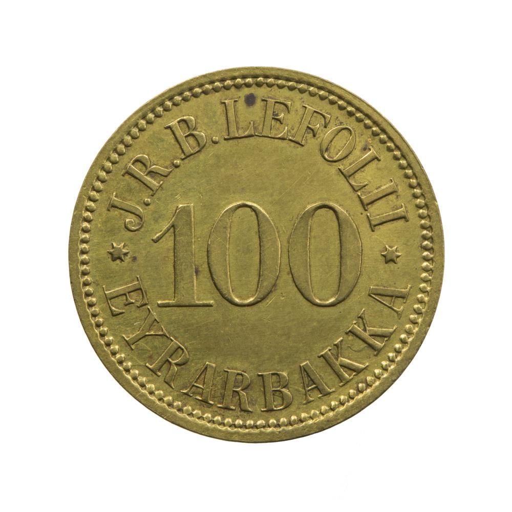 Þessi 100 aura vörupeningur var framleiddur fyrir verslun J. R. B. Lefolii á Eyrarbakka. Peningurinn var gjaldgengur í verslun Lefolii frá því um 1900 til ársins 1902. Líkur benda til þess að peningarnir hafi verið sleginn af L. Chr. Lauer í Þýskalandi með milligöngu N. Hansen & Co í Danmörku.