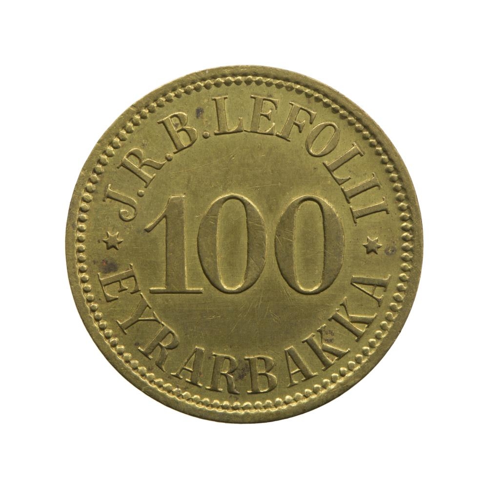 Þessi 100 aura vörupeningur var framleiddur fyrir verslun J. R. B. Lefolii á Eyrarbakka. Peningurinn var gjaldgengur í verslun Lefolii frá því um 1900 til ársins 1902. Líkur benda til þess að peningarnir hafi verið sleginn af L. Chr. Lauer í Þýskalandi með milligöngu N. Hansen & Co í Danmörku.