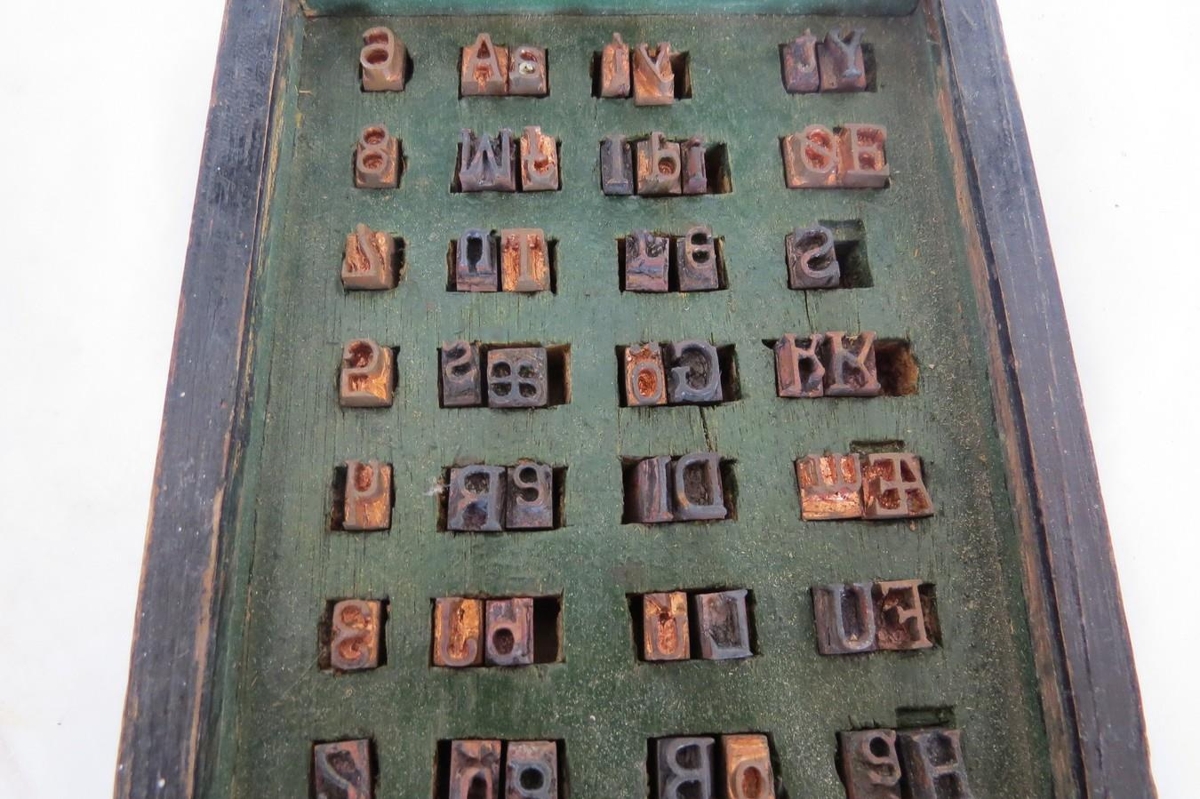 Box með stimplasetti. Stöfunum er hægt að raða að vild í haldara sem fylgir með settinu.
