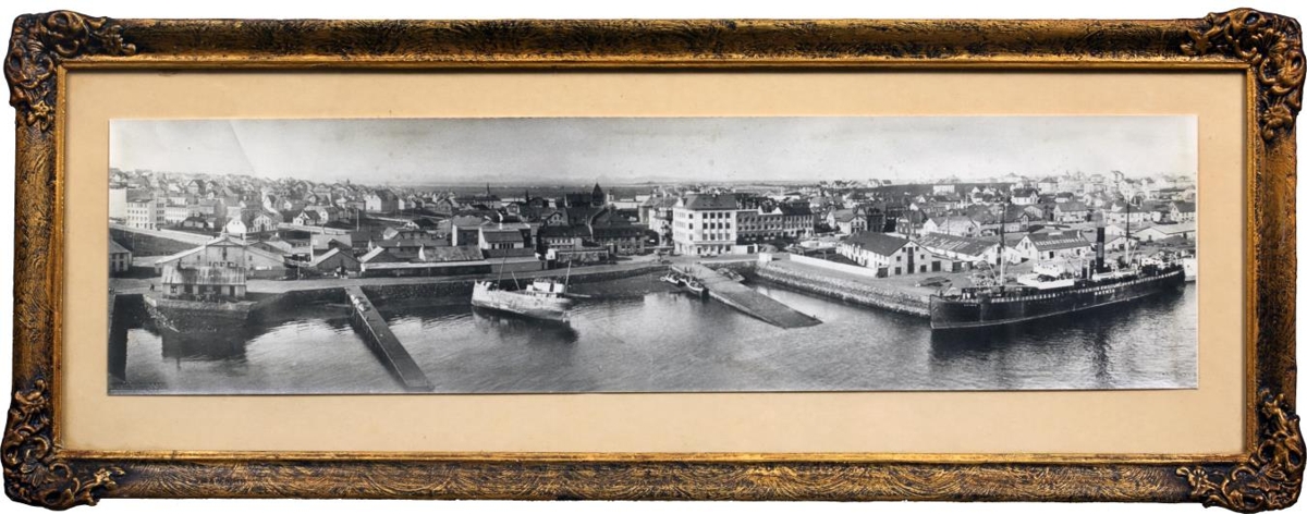 Panoramamynd af Reykjavíkurhöfn. Farþegaskipið Botnia liggur við hafnarbakka yst t.h., þar má sjá vörugeymslu með heitinu „H. Benediktsson & co.“ málað á þakið.