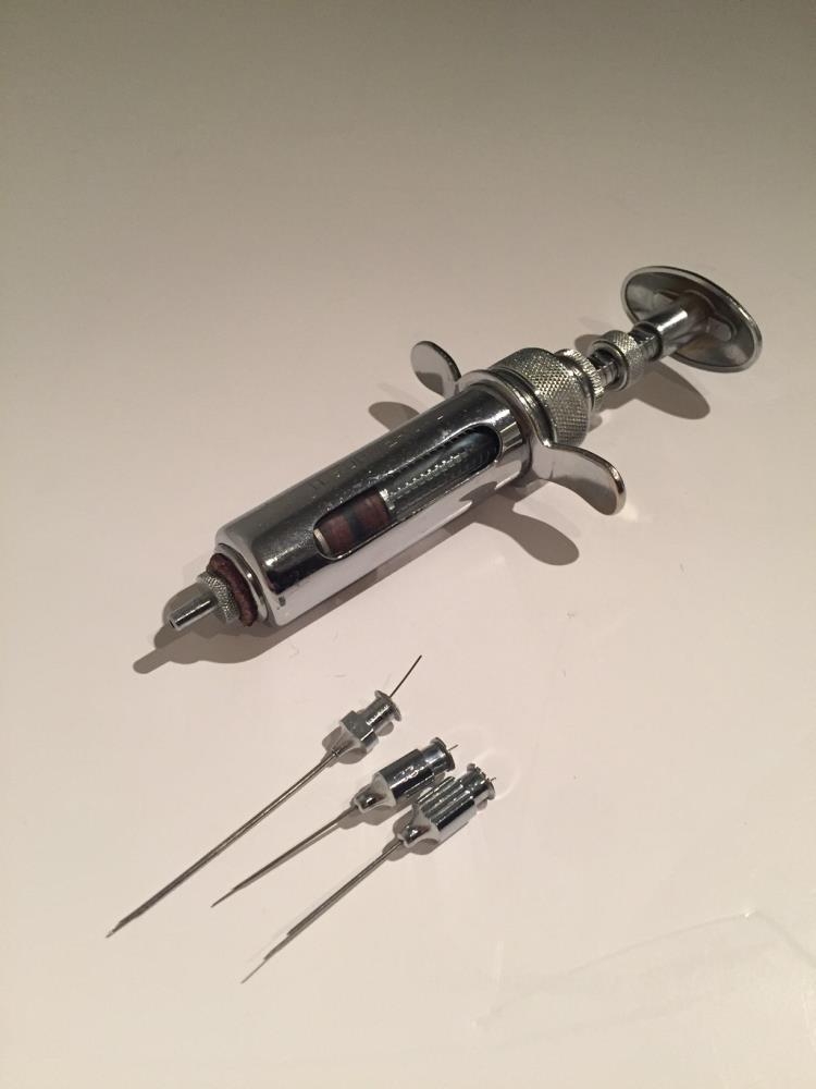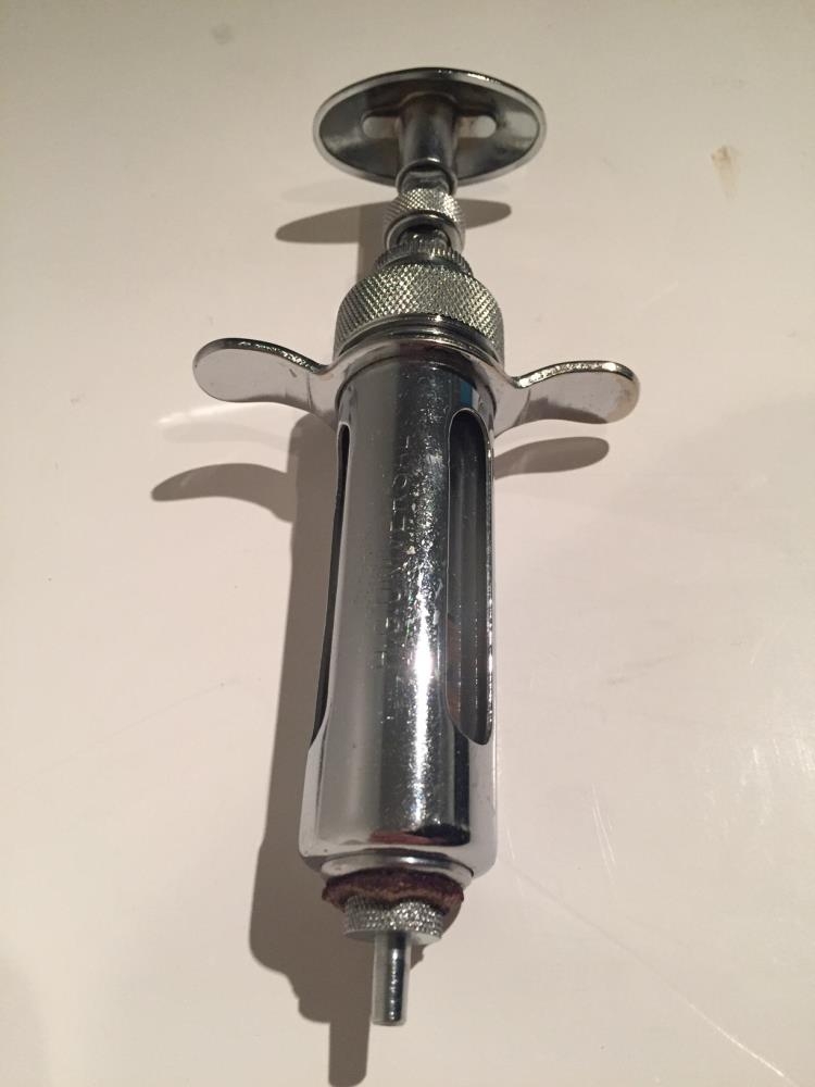 Margnota sprauta til dýralækninga í öskju sem er 16,5 x 8 x 2,5 cm að stærð. Á sprautunni stendur H. G. UNIVERSAL. Sprautuna er hægt að skrúfa í sundur og á henni er hægt að skipta um nálar. 3 nálar fylgja með í öskjunni.