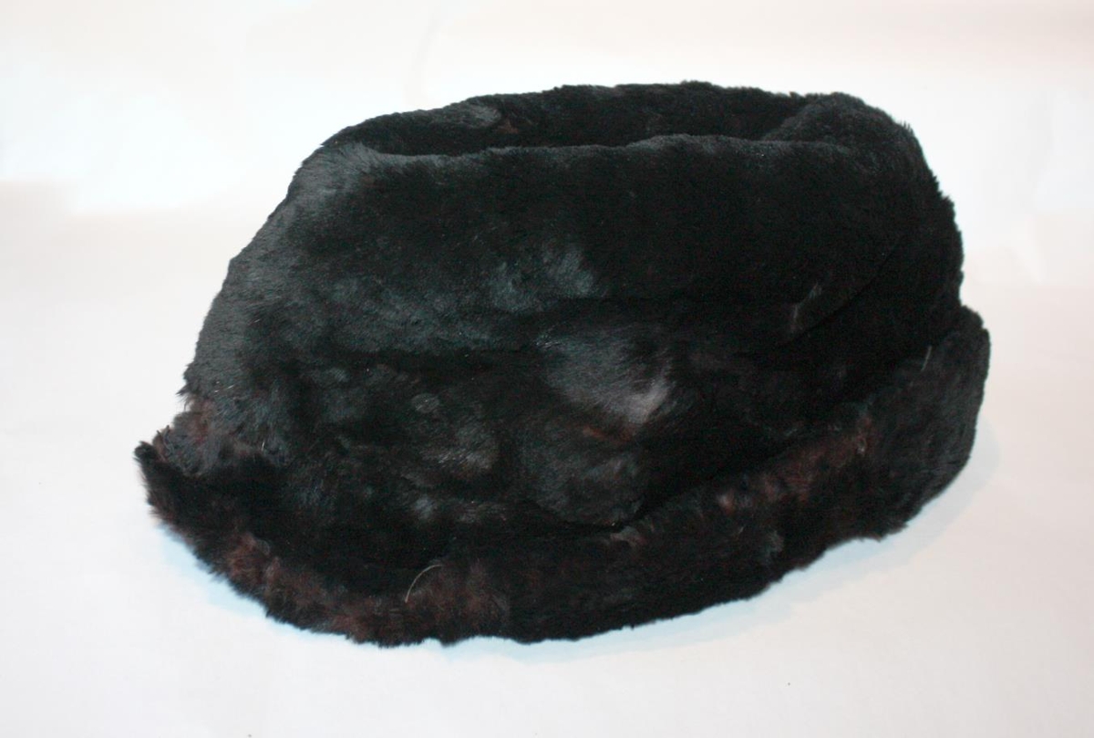 Húfa svört úr mjúku fíngerðu skinni frá DAELLS VAREHUS. Á miða skrifað vetrahúfa Jóns Helgasonar biskups. Dóttir Jóns Helgasonar. Cecilía Helgason húsfreyja á Lindarhvoli Þverárhlíð, gaf safninu húfuna og hatt ( sjá nr 74 ) í feb 1964