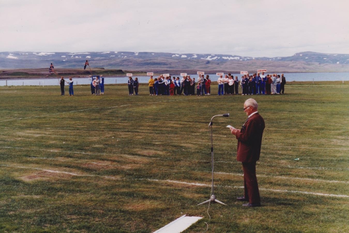 Ljósmynd frá setningu héraðsmóts HSS í Sævangi á níunda áratugnum. Ingimundur Ingimundarson heldur ræðu eftir að íþróttaliðin hafa komið sér fyrir á vellinum.