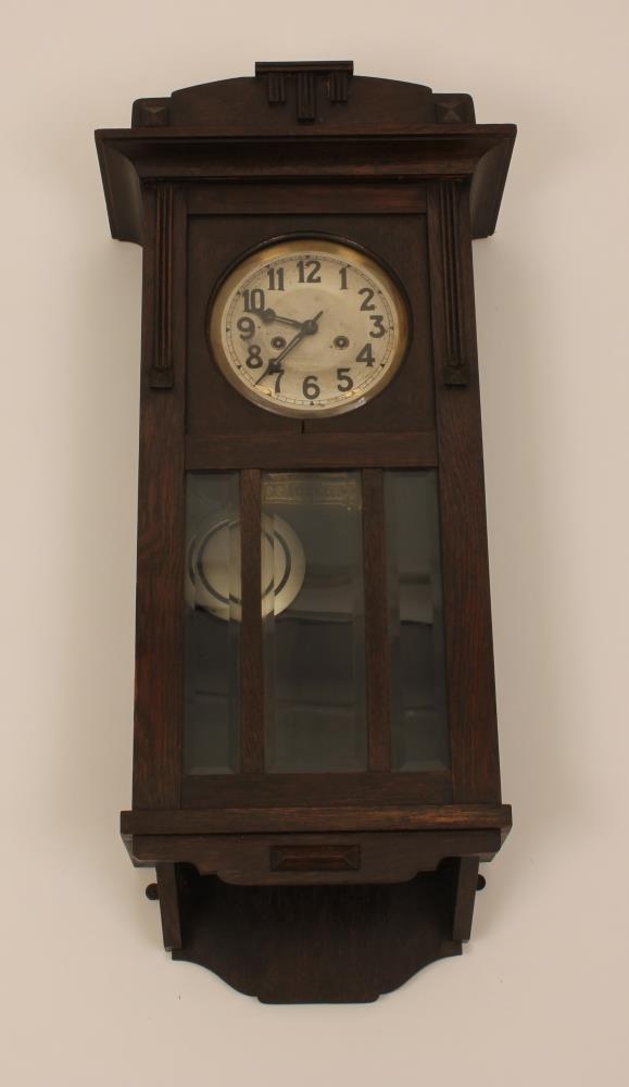 Veggklukka, dökkur viðarkassi. Klukkan hékk lengi á Vefnaðarstofu Karólínu Guðmundsdóttur, Ásvallagötu 10b í Reykjavík.