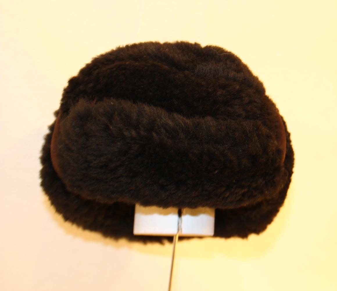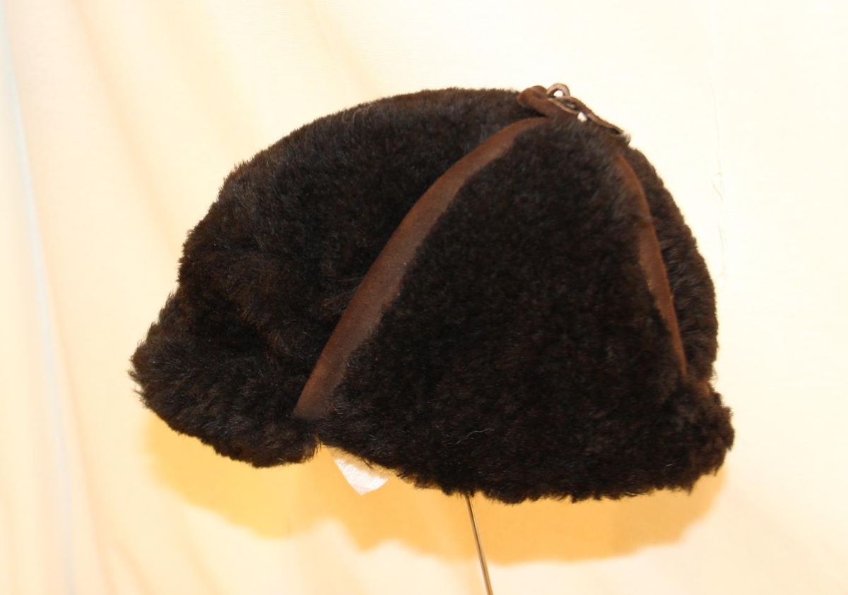 Húfan er skinnhúfa. Loðskinn snýr út með skyggni og eyrnaskjólum sem eru bundin upp.