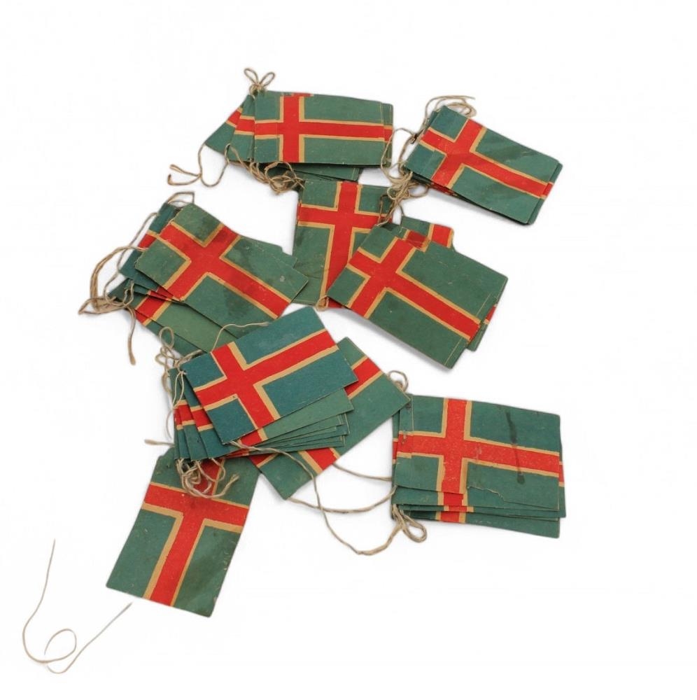 Jólaskraut á jólatré. Fylgdi jólatré ÁBS 2017-66-2. Rauð snúin kerti, kertaklemmur, fánar, þrjár bjöllur og tvær kúlur eins og jólasveinar.