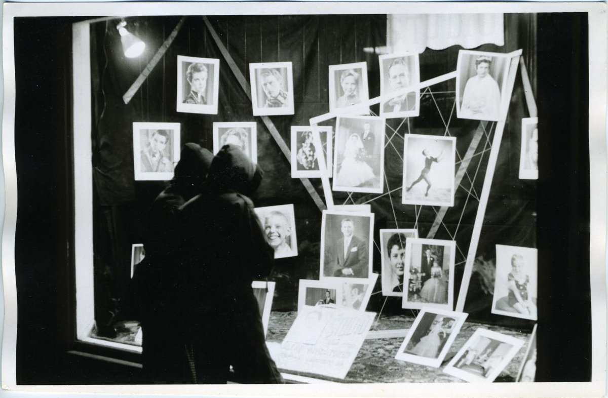Tveir vegfarendur skoða útstillingu á ljósmyndum í sýningarglugga. Efst t.h. má greina heitið STUDIO á skilti.