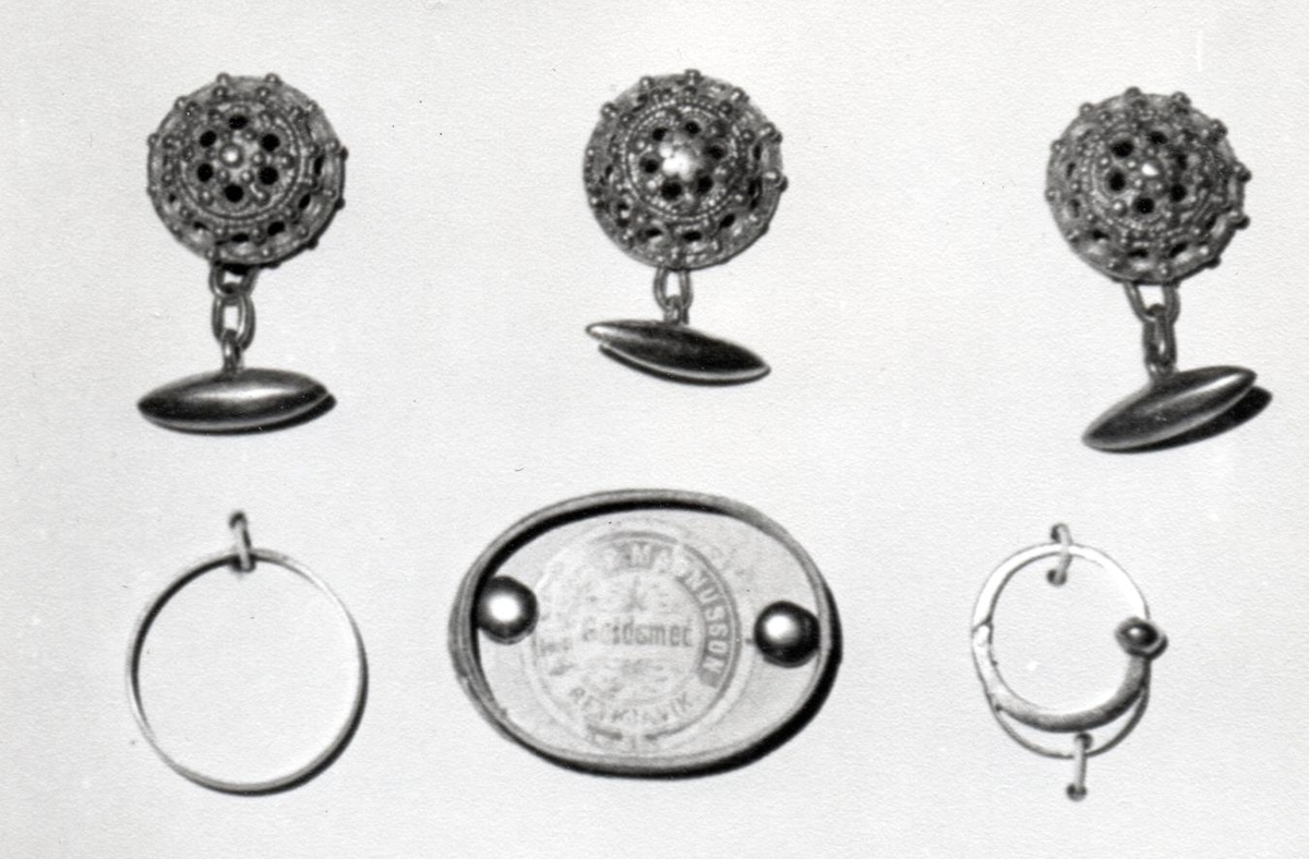 Þrír ermahnappar, kringlóttir úr silfri með flúri. Einn giftingarhringur úr gulli merktur H.G. Einn eyrnalokkur fyrir gat í eyra, lítill hringlaga úr gulli. Lok af lítilli pappaöskju undan hring líklegast, merkt Erlendi Magnússyni gullsmið í Reykjavík