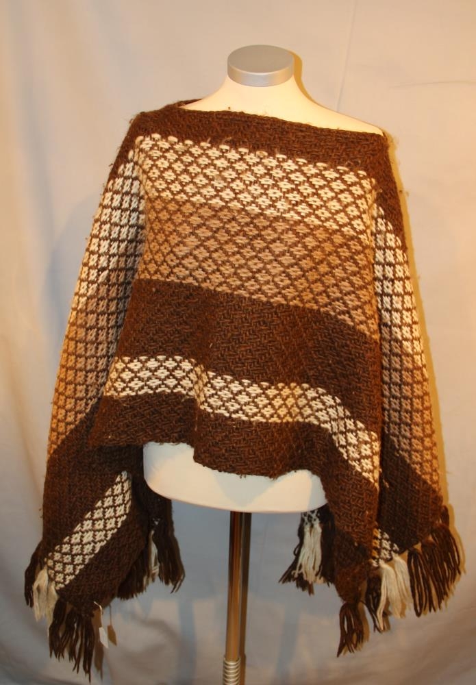 Flíkin er axlaslá (poncho), dökkbrún með munstri og er handofin á vefstofu Guðrúnar Vigfúsdóttur á Ísafirði. Stærð: Medium.