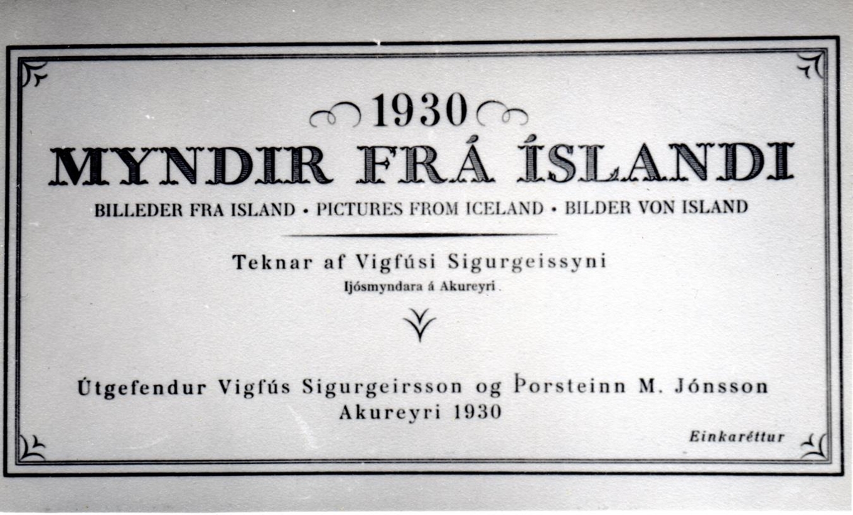 Myndabók með myndum frá Íslandi sem Vigfús Sigurgeirsson tók. Skjaldarmerki Íslands þrykkt á kápu. 24 myndir eru í bókinni.