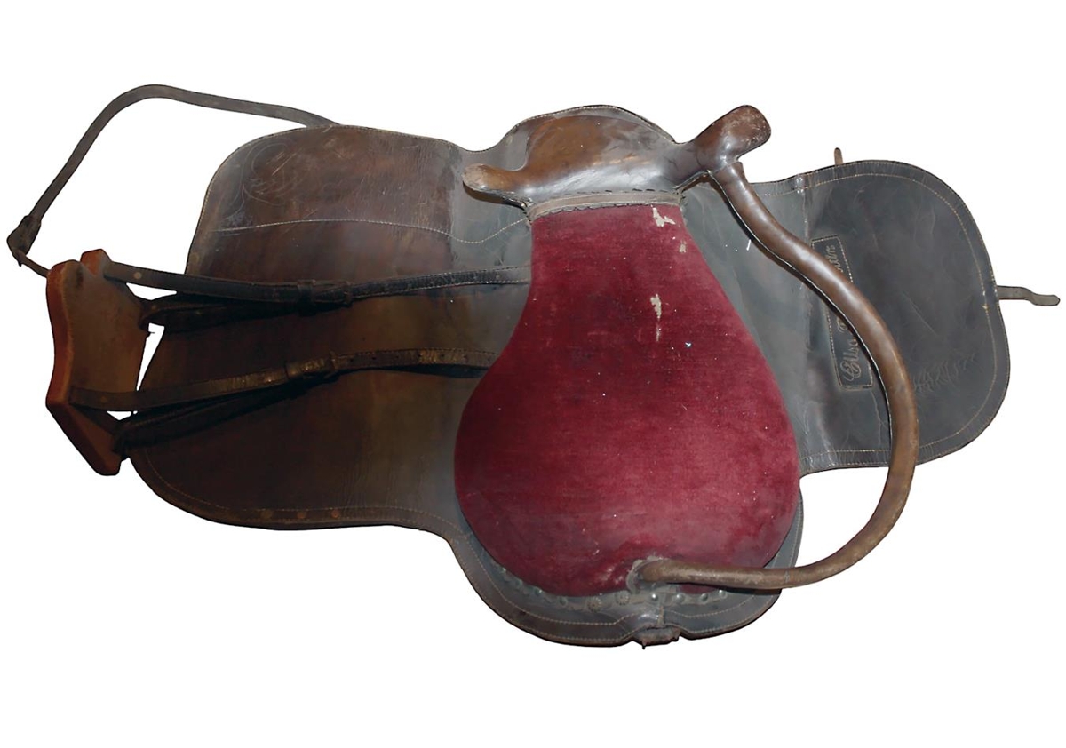 Söðull með nafni eigandans ásaumuðu á hlífina.